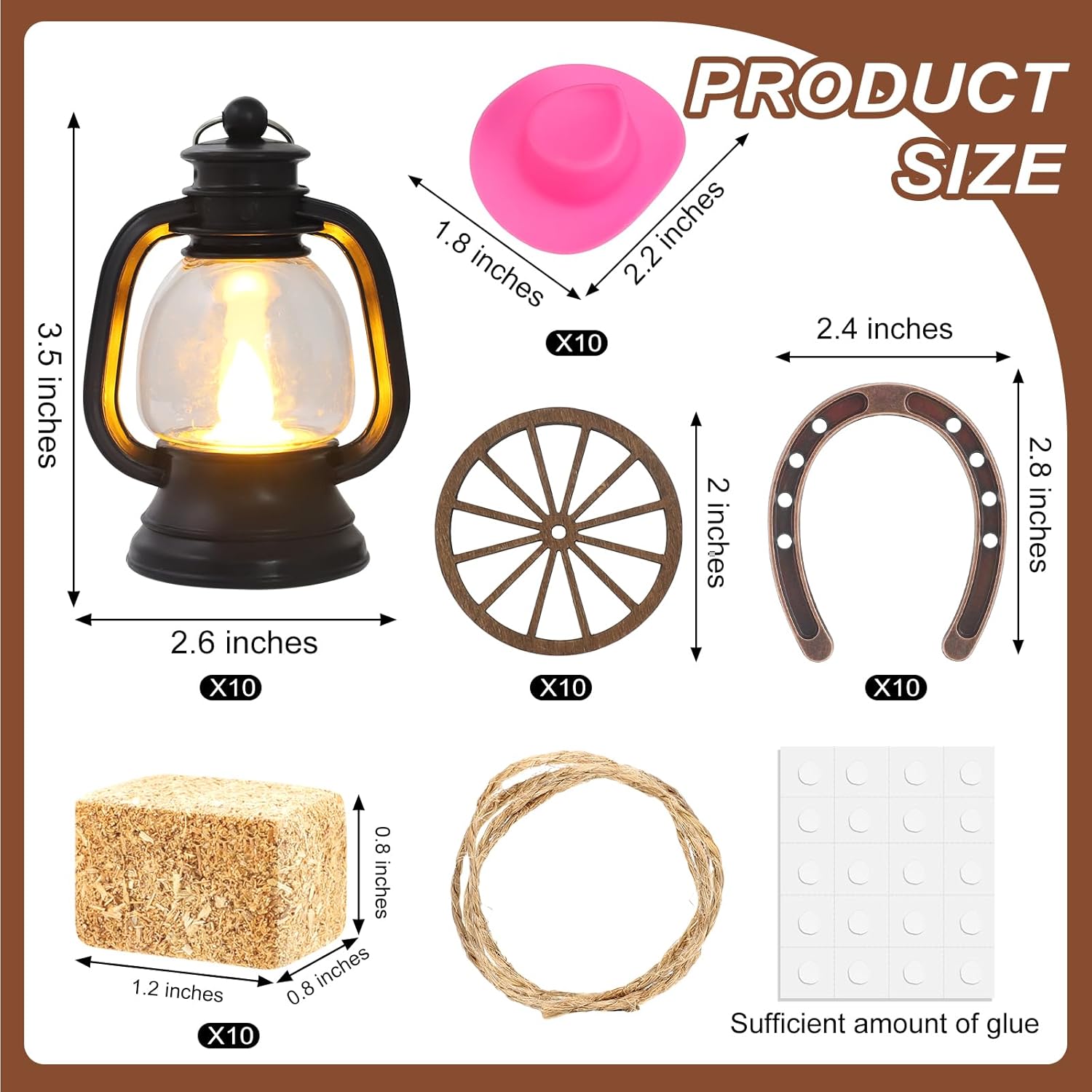 Whether you are planning a cowboy party or looking for a unique lucky charm for your gathering, our western theme party centerpiece is the ideal choice to add a touch of rural charm to your home, office, or party, highlighting the rugged beauty and enticing allure of Western cowboy style, leaving a deep impression on people Retro Western Themed Decor: Our cowboy party decorations are cowboy-themed, with mini black candle lanterns emitting a warm glow that can also be attached to a cowboy hat with glue, and mini wagon wheel, horseshoes and hay bales as centerpieces to recreate a true western environment and create a retro cozy atmosphere, which can be combined or individually decorated with flexibility and person Widely Applicable: This western centerpieces decor is suitable for cowboy themed parties, Halloween, Christmas, Western themed birthday parties, weddings, camping parties, Valentine's Day, and other occasions, but also use this lantern decoration to light up your bedroom, study, kitchen, fireplace, porch and other places you want, with the decoration of the author, easily enhance the warm and elegant atmosphere Specifications: Material: Mini lantern and cowboy hat : plastics Wagon wheel and hay bale: wood Horseshoe: iron Color: as shown in the picture Size: as shown in the picture Package Includes: 20 X Mini Lantern 20 X Mini Brown Cowboy Hat 20 X Wooden Wagon Wheels 20 X Mini Hay Bale 20 X Horseshoe Notes: Manual measurement, please allow slight errors on size. The color may exist a slight difference due to different screen displays.