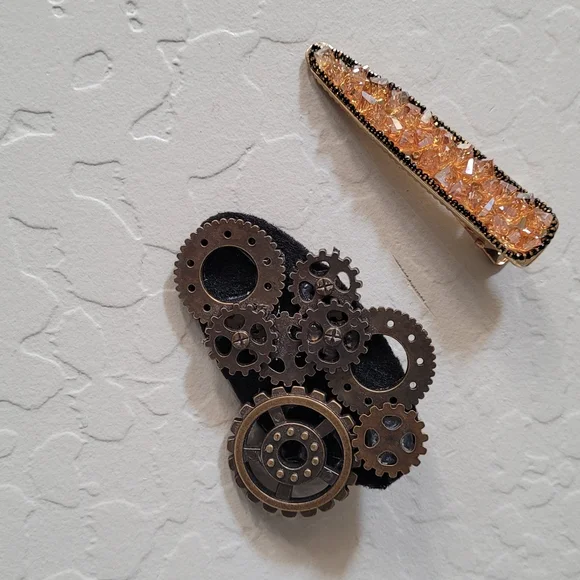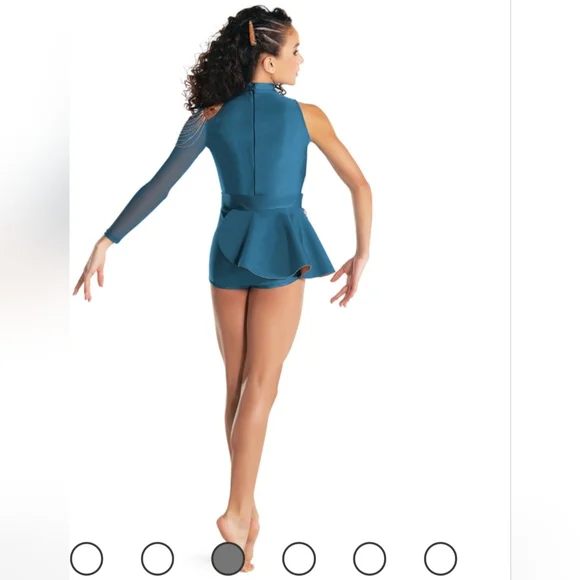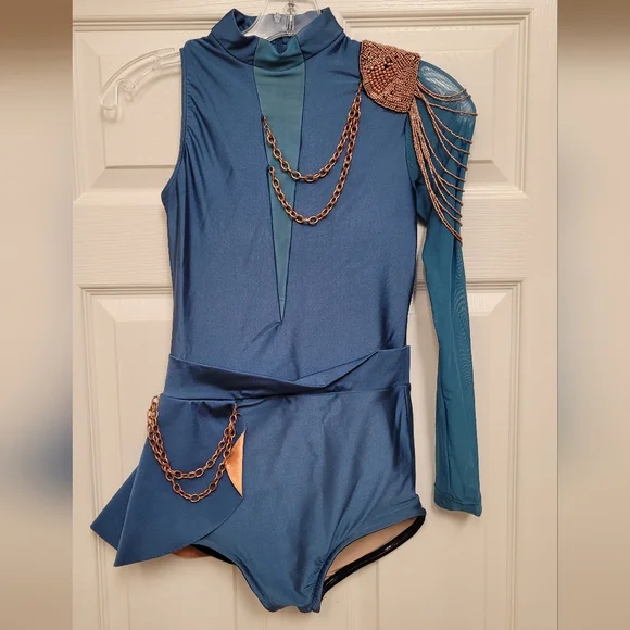 - Spandex leotard- Spandex waistband- Attached spandex half skirt with contrasting stretch satin- Mesh sleeve and lined mesh front bodice inset- Attached beaded shoulder epaulette- Removable chains on the bodice and hip- Elasticized slip grip leg line- Fully functional zipper at the back- Fully lined- Glitter-free!Includes two hair clips. Excellent used condition!