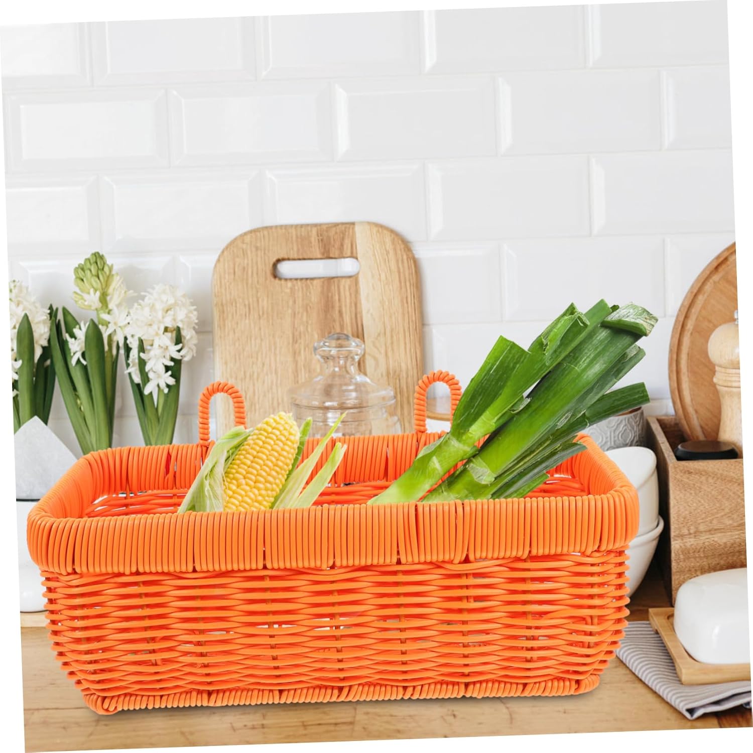 Package Include 3 x woven basket Features - Practical and functional: Ideal for organizing your kitchen or garden. Woven design adds a touch of elegance hanging wall basket. -Size:14.50X11.00X15.00cm/5.70X4.32X5.89in(S) woven storage -Size:28.00X16.00X13.00cm/11.00X6.29X5.11in basket for kitchen -Material:Plastic garlic basket - Portable: Can be carried by hand for easy transport. Made of sturdy materials for durability and reliability wall basket. -Color:Orange hanging - Easily Hanging it at any place you want, suitable for placing bananas, onions, tomatoes, potato and much more woven storage basket. - Help you to save more space in the kitchen, this hanging basket can keep your space clean, tidy and organized wall storage basket. - Match well with most kitchen decoration and this woven hanging basket can bring more charm, more beauty small hanging basket.Goods Descriptionkitchen storage holder This woven storage basket is great for home organizing, with hanging handle design that can be hung on the wall.hanging fruit basket It can store all kinds of cutlery, can be hung on the wall as basket decorations and can also store toiletries, easily matching your interior decoration.hanging Wide application, good hanging basket for kitchen to store garlic, ginger and so on