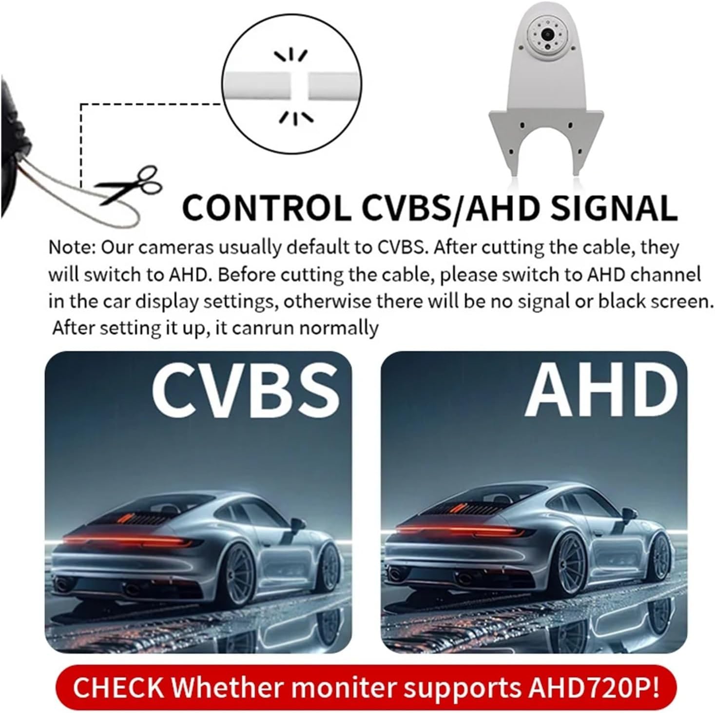 NOTE:(1)Please check if your Android monitor supports AHD720P before purchasing(2)Our car camera only supports Android large screens. Please check carefully before purchasing(3)Because there may be slight differences between carsproduced in different countries, please check the size beforebuying.Note: Cameras with CVBS CCD video signal is universal Compatible With all monitors, but AHD signal will only work with AHD monitor! *If AHD720P cannot be selected, AHD720P cameras are not supported!SO, if the monitor does not support AHD signal, it can be switched to CVBSAdjustment to AHD signal via monitor settings is required before mounting the camera:Go to Car settings >> Factory settings >> Reverse (picture) settings >> Select AHD720PConversion Line Control*Note:If the monitor does not show the image, you can cut the white line to switch to another channel, and then reconnect the cameraPossible issues that may arise during the installation processAfter installation, black screen, no signal, blurred screen, and black and white image appearResolvent:1. Check if the camera cable is not properly connected2. First, check if the Monitor is on the same channel as the camera,as our camera is Dual channel camera, so it is necessary to confirm whether the camera is a CVBS or AHD channel, usually The default is CVBS channel, and after cutting the green line, it becomes AHD channel. After confirming the camera channel,It is necessary to set up channels corresponding to the camera on the car Monitor, such as the camera Compatible With AHD channel, the monitor needs to be set to AHD 720P channel. If the camera If it is a CVBS channel, set the Monitor to CVBS/NTSC==========Lens Material : Plastic + GlassLength of Video Cable : 10MShell Material : PlasticWire or : WireOrigin : Mainland ChinaViewing Angle : 170°Material : ABSWelcome to my auto parts s