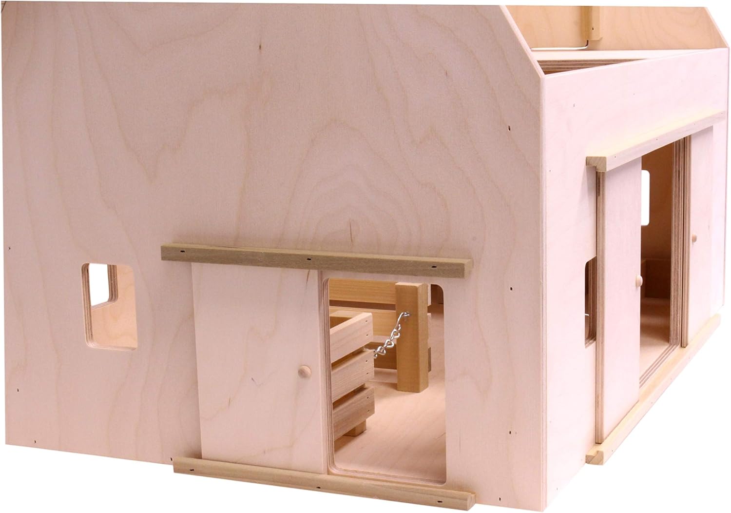 Bring your child’s imagination to life with our Deluxe Hip Roof Barn Toy, a handcrafted masterpiece from Amish artisans in Shipshewana, Indiana. This large wooden barn is more than just a toy—it's a cherished keepsake designed for years of enjoyment. Featuring a sturdy sliding door, an opening roof for easy access, and a movable hay loft, this large barn toy offers realistic play while encouraging creativity. The barn’s thoughtful design includes six animal tie stalls, perfectly sized at 2" wide, 1.5" high, and 3.5" long, along with a spacious 8" x 9" box stall for larger animals or imaginative scenarios. The 7" x 7" wide doorway ensures plenty of space for pretend farm chores, while the removable haymow can slide to either side, adding flexibility to the play experience. With a height of 9" from the haymow to the floor, your child can create dynamic stories of feeding animals or storing hay. Crafted with care, the barn remains unfinished, providing a natural, safe surface for your child’s hands and giving you peace of mind. Measuring 27"L x 17"W x 18"H, this wooden toy barn is a substantial, high-quality addition to your child’s playtime and a best-seller for good reason. Its timeless charm and durable construction make it a gift that will be loved and remembered for generations. Bring back old-fashioned fun to your family with a Hip Roof Barn Toy from AmishToyBox.com.
