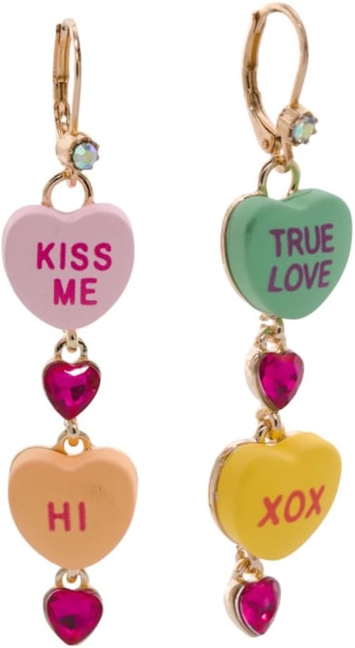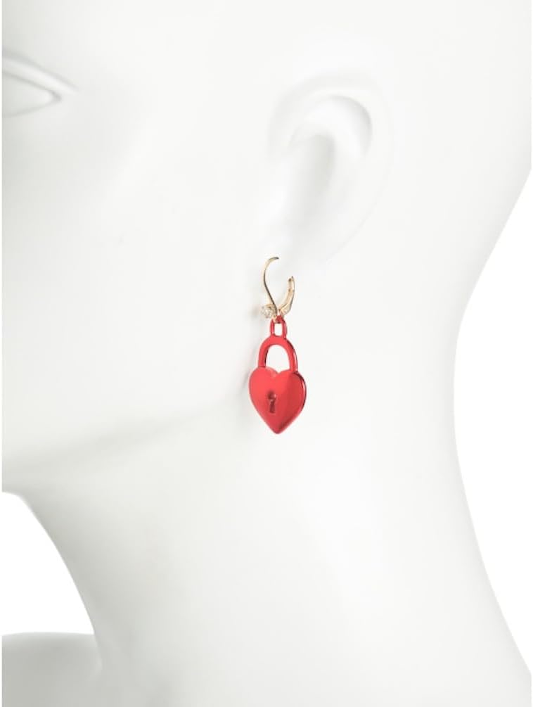 These playful Betsey Johnson mismatched earrings bring whimsy and romance to your jewelry collection with their charming lock and key design. One ear features a gold-tone key with a heart-shaped bow, while the other showcases a glossy red heart-shaped padlock complete with a keyhole detail. Each earring is adorned with a sparkling crystal accent at the lever back closure, adding a touch of glamour to this quirky set. The mismatched styling makes a bold fashion statement that's perfect for expressing your unique personality. These dangle earrings are ideal for adding a fun, flirty touch to both casual and dressy outfits. The secure lever back closures ensure comfortable all-day wear while keeping your earrings safely in place. Whether you're treating yourself or searching for a memorable gift, these distinctive earrings capture the playful spirit that Betsey Johnson is known for. The combination of gold and vibrant red creates an eye-catching contrast that's sure to spark conversations and compliments wherever you go.