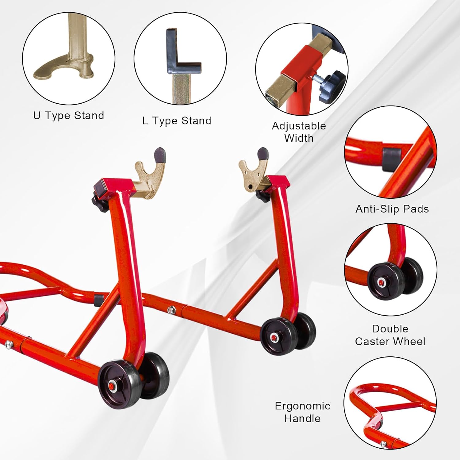 Strong Capacity: Motorcycle wheel lift stands max capacity 850 lbs., lift the motorcycle from the ground and support it safely for easy maintenance as well as repairing tasks. Motorcycle stand sturdy made of metal frame, durable structure not deform easily, red powder coated resists rust, oil, dirt and corrosion resistance.(1 Motorcycle stand,1 U-shape,1 L-shape). Motorcycle rear stand for 8.56“ to 11.61” wide wheels and motorcycle rear stand for 9.06“ to 13.78” wide wheels for most bikes and motorcycles such as Yamaha, Suzuki, Honda, Kawasaki, BMW etc. Motorcycle stand accessories are easy to assemble as well as disassemble, it only takes a few minutes to assemble this motorcycle stand. 4 rolling wheels for easy mobility, easy to move and store. Whether you're at home or repair store, with this front and rear motorcycle stand, you can conveniently clean chains, change tires and oil, providing easy support for cleaning and maintenance