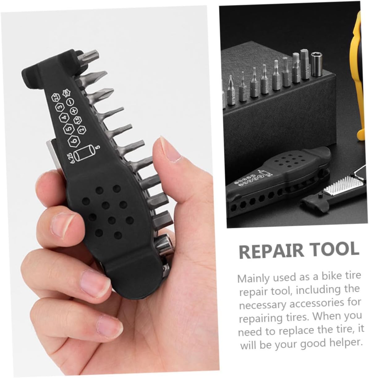 Package Include 1 x pair of tire-levers 1 x socket spanner 1 x socket 10 x converting heads 1 x tire file patch 1 x tire repair patch Characteristics -Material: Plastic nylon, fiberglass, high carbon steel tire maintenance tools. -Color:Black tire quick repair equipment -Size: About 11.50X3.00X3.00cm/4.52X1.18X1.18inch bike tire patches. -As a bike tire repairing tool, it can help to do basic maintenance when you are not cycling cycling repair tool. -Portable combination design, detachable tire levers on both sides, is a very professional and tool for bicycles tire repair multi-function repair tool. -Mainly used as a bike tire repair tool, including the necessary accessories for repairing tires. When you need to replace the tire, your helper bike repair kit. -Made of , it is long-lasting and . Easy to carry and prepare for emergency needs while riding tire patch tool. -It is manufactured with professional technology to ensure the of the product and can work for a long time bicycles tool kit.Goods Descriptionportable repair tools It is lightweight and easy to carry and covers your essential tools needed for repairing bikes.bike tire patches This item is a professional bike tire repairing tool set.tire repair equipment Enjoy your outside cycling with more safety.bike tire repair kit Made from , it is and for long time use