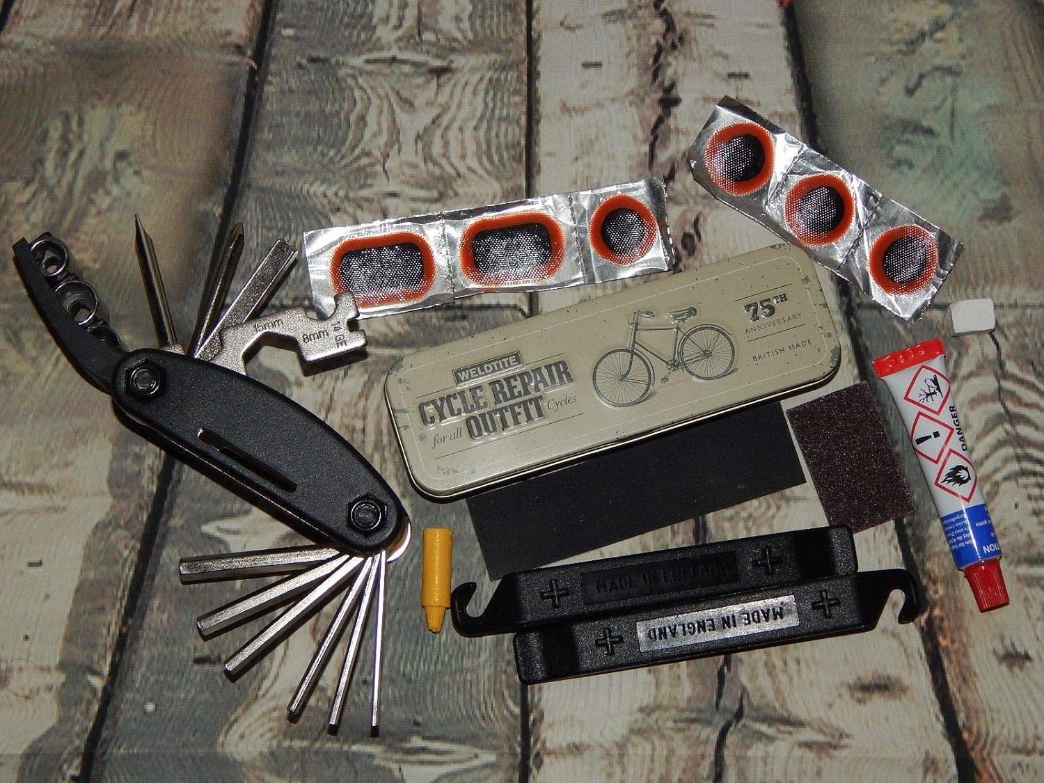 This lot contains: 1) Type: Saddle / Handlebar Bag Style: Retro / Vintage Material: Canvas + 100% Genuine Leather Compatibility: any types of saddles (3 straps securely hold the bag) Aprrox Size: Length 12.5" Height 11" Width 3.8" Features: 2 pockets, 2 sections, 3 leather straps 2) 16 in 1 repair tool: 2.5mm hex wrench 3mm hex wrench 4mm hex wrench 5mm hex wrench 6mm hex wrench 8mm socket spanner 9mm socket spanner 10mm socket spanner 8mm slab wrench 10mm slab wrench 15mm slab wrench 14G spoke wrench Phillips screwdriver 3) Puncture Multifunctional Repair Tool: tyre levers chalk crayon sandpaper rubber solution individual patches traditional rubber patch strip metal vintage box repair instruction