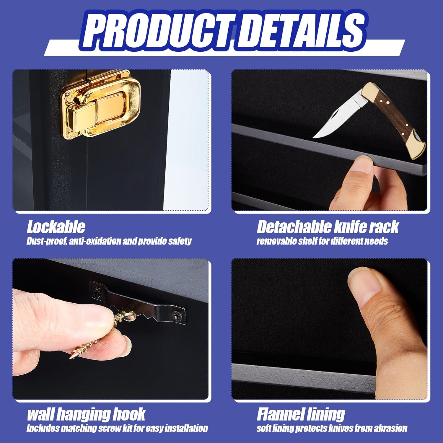 Features: The acrylic lockable display cabinet is convenient for you to clean and care, simply wipe with a damp cloth occasionally, then dry in a ventilated place, which can save much time and efforts for you. The black knives storage box is simple but classical in style, conforming to the aesthetic standards of people of different ages, so when you place it on the table or other countertops, it will catch the attention of others quickly. Specifications: Material: wood high density fiberboard, acrylic board, flannelette Color: black Size: External size: about 14''L x 2.1"W x 17.6"H Height of each layer: about 1.9 inches Internal depth: about 0.9 inches Package includes: 1 x Knife display case Notes: Manual measurement, please allow slight errors on size. The color may exist a slight difference due to different screen displays.