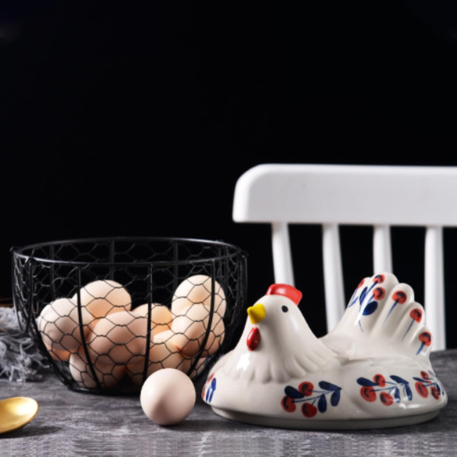 Description: Ceramic Egg Holder with its charming chicken design, sturdy construction, ample capacity, convenient handle, and ability to preserve egg freshness is an excellent for anyone who gathers and enjoys fresh eggs. Add a touch of whimsy to your kitchen while keeping your eggs organized and easily accessible with this delightful and functional egg holder. Features:. Egg Basket for Gathering Fresh Eggs. -Color: As shown. -Material: Ceramic+Wire. - Size: Basket: 19.5x12 cm/7.68x4.72 inch. Lid:19.5x11.5 cm/7.68x4.53 inch. Note: Manual measurement, please allow slight errors on size. The colors may exist slight difference due to different screens. Package Including 1 * Egg Basket for Gathering Fresh Eggs