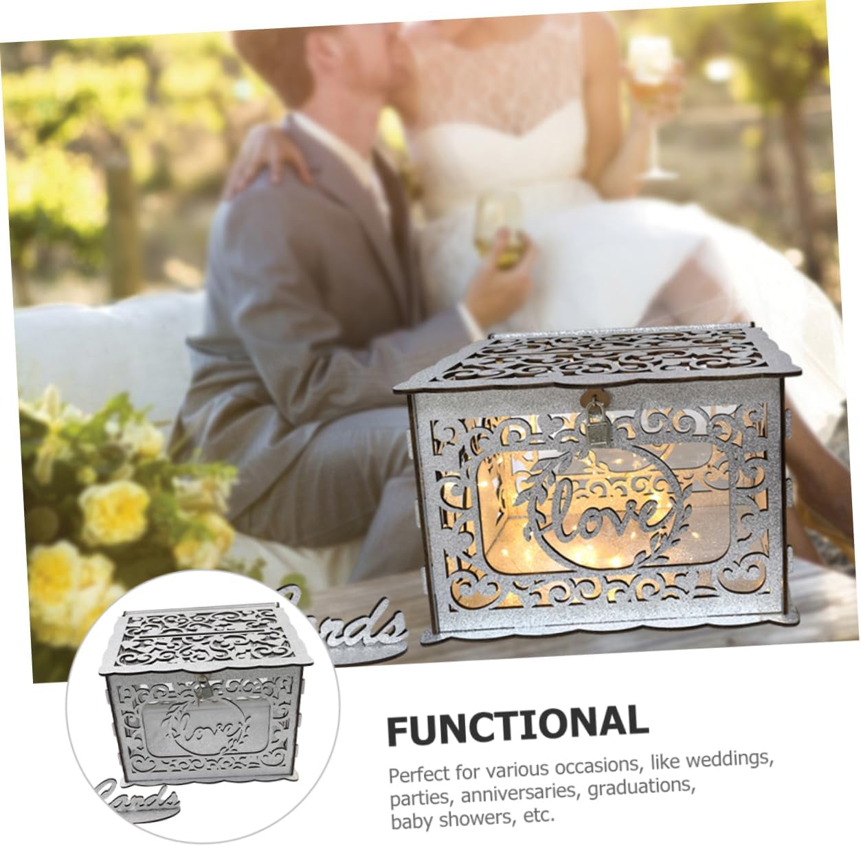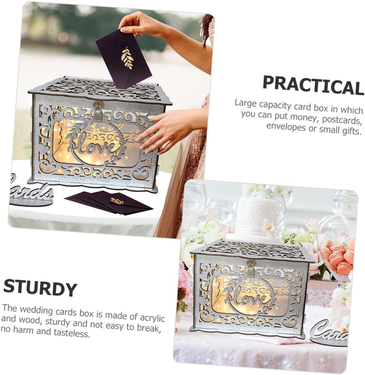 Package Include 1 x 1 x Sign 1 x Lock 2 x Keys Features -Material:Wood,Acrylic greeting cards container - Size: 30.00X24.00X22.50cm/11.79X9.43X8.84in wedding card holder - Color: card holder - A place for guests to put their , cards, small , etc. This cards box can bring more conveniences anniversary cards container. - This cards box not only is for collecting cards, it can also be used as a keepsake box. greeting boxes - Card box with hollow design, a wonderful decoration of the wedding day, also can be a great addition to party. blessing card container - The wedding wood cards box is very delicate, beautifully made with a hollow out design anniversary card boxes. - This wedding cards box is a great collect that greetings and from family and friends! card containerGoods Descriptiongreeting boxes Are you looking wedding reception cards box? This rustic wedding reception cards box can meet your using needs.greeting cards container With understated and elegant design, enough attention to let guests notice it, but not too much to the home decor.blessing card container This wedding is designed for storing and securing present cards or envelopes for wedding party