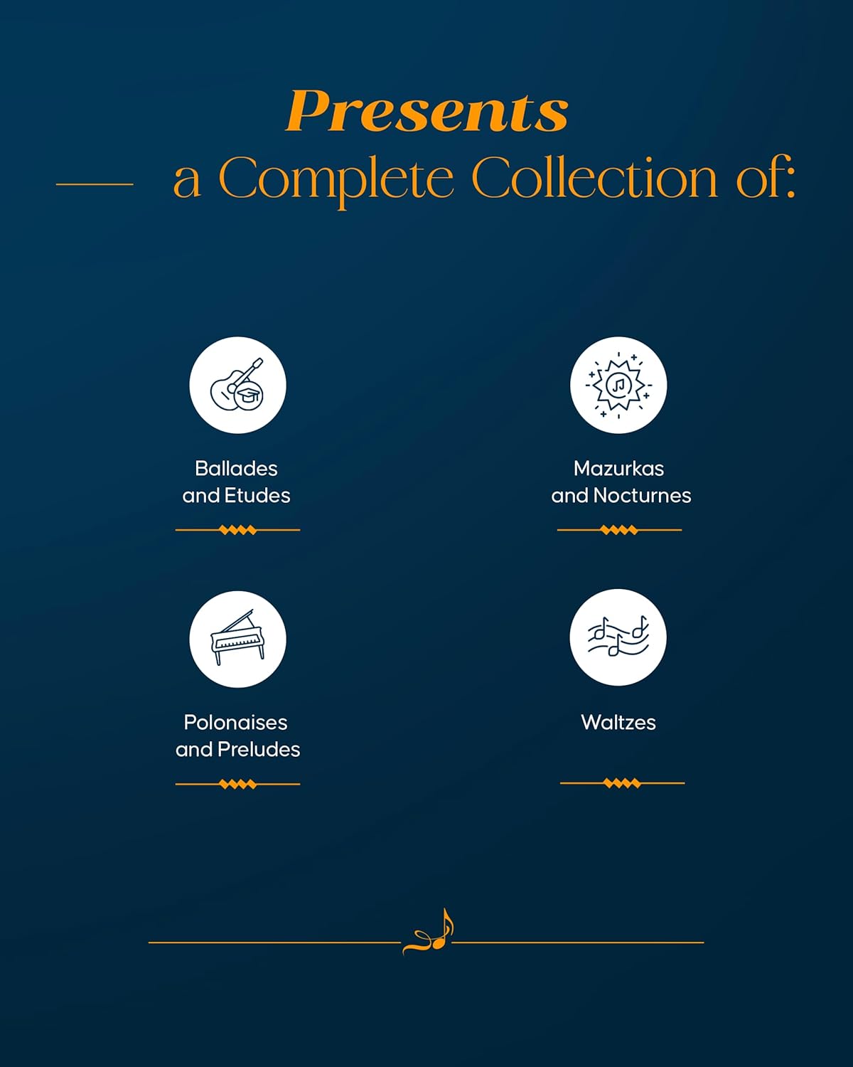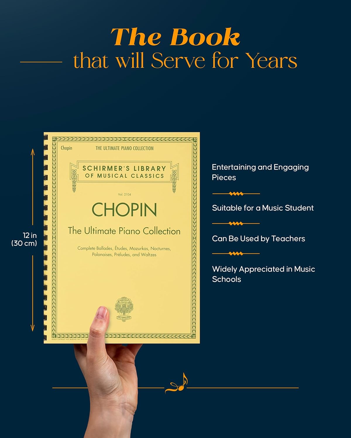 This comprehensive piano collection is created for intermediate to advanced pianists who want to study, perform, and fully understand the music of Frederic Chopin. Ideal for conservatory students, teachers, and dedicated adult learners, this volume supports daily piano practice, recital preparation, and long term repertoire development.Inside this extensive 724 page piano anthology, players will discover nearly the complete solo piano works of Chopin presented in a clear and carefully engraved format. The collection spans lyrical, expressive, and technically demanding compositions, allowing pianists to explore every major style and period of the composer?s output. The breadth of material makes it suitable for structured lessons, advanced self study, and professional teaching environments.This edition helps build confidence and technique while improving musical expression, phrasing, and interpretive depth. Working through these works strengthens finger independence, control, and stylistic awareness, while encouraging artistic growth through some of the most influential piano music ever written. Teachers will find it a dependable music teacher resource, while serious students benefit from having a complete reference in one volume.The thoughtfully designed layout supports long practice sessions, making page reading comfortable and efficient. Whether preparing for examinations, recitals, or personal mastery, this collection offers lasting value for pianists committed to classical piano study.Song List Ballades * Etudes * Mazurkas * Nocturnes * Polonaises * Preludes * Waltzes * and many more essential solo piano works by Frederic Chopin.Bring music to life. Perfect for lessons, performances, and lifelong learning, this ultimate Chopin collection celebrates one of history?s greatest composers and inspires pianists to grow through timeless classical music. Read more