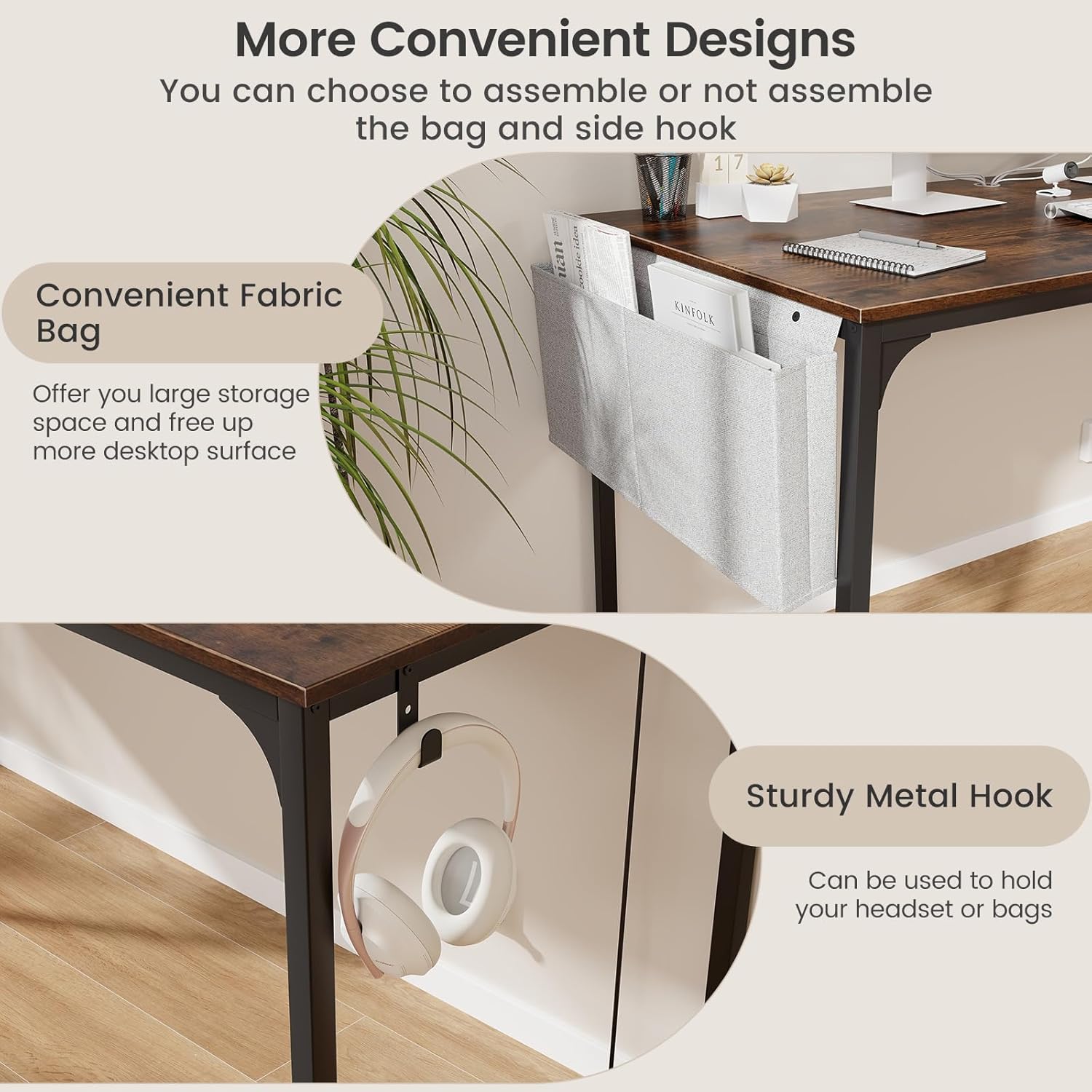 Description:Are you looking for a versatile and efficient workstation that keeps up with your modern lifestyle? Look no further than our office desk. The built-in recessed power strip offers 2 power outlets (12A / 125V) and 2 USB ports (5V/ 2A), ensuring easy device charging. And the spacious desktop provides ample room for your essentials, perfect for focused work or creative tasks. Besides, the convenient bag and sturdy metal hooks offer added storage and organization options, optimizing your workspace. With a robust powder-coated metal frame and a stable triangular structure, this desk ensures long-lasting durability and reliable support. Whether you need a gaming desk, study desk, or conference table, this desk's minimalist design and wide surface area cater to all your needs, making it the ultimate multifunctional solution.Features:Ample work surface for monitor and supplies displayThoughtful storage bag keeps essentials within reachStable triangular structure with reinforced X-bar bracket ensure stable useRecessed power strip with 2 power outletsAdjustable foot pads provide extra stability to the whole frameSturdy metal hook for holding headset or bagsEasy maintenance with smooth desktop surfaceVersatile desk suitable for various uses such as study, officeSpecifications:Color: White + BlackMaterial: Engineered Wood, MDF, Metal, FabricProduce Dimension: 36.5” x 24” x 29” (L x W x H)Dimension of Tabletop: 32” x 24”(L x W)Inner Size of Storage Bag: 22” x 4” x 10” (L x W x H)AC Outlet: 125V/12AUSB Port: 5V/2APower Cord Length: 6.5 FTNet Weight: 23 lbsWeight Capacity of Desktop: 210 lbsWeight Capacity of Storage Bag: 10 lbsPackage Includes:1 x Computer Desk1 x User Guide
