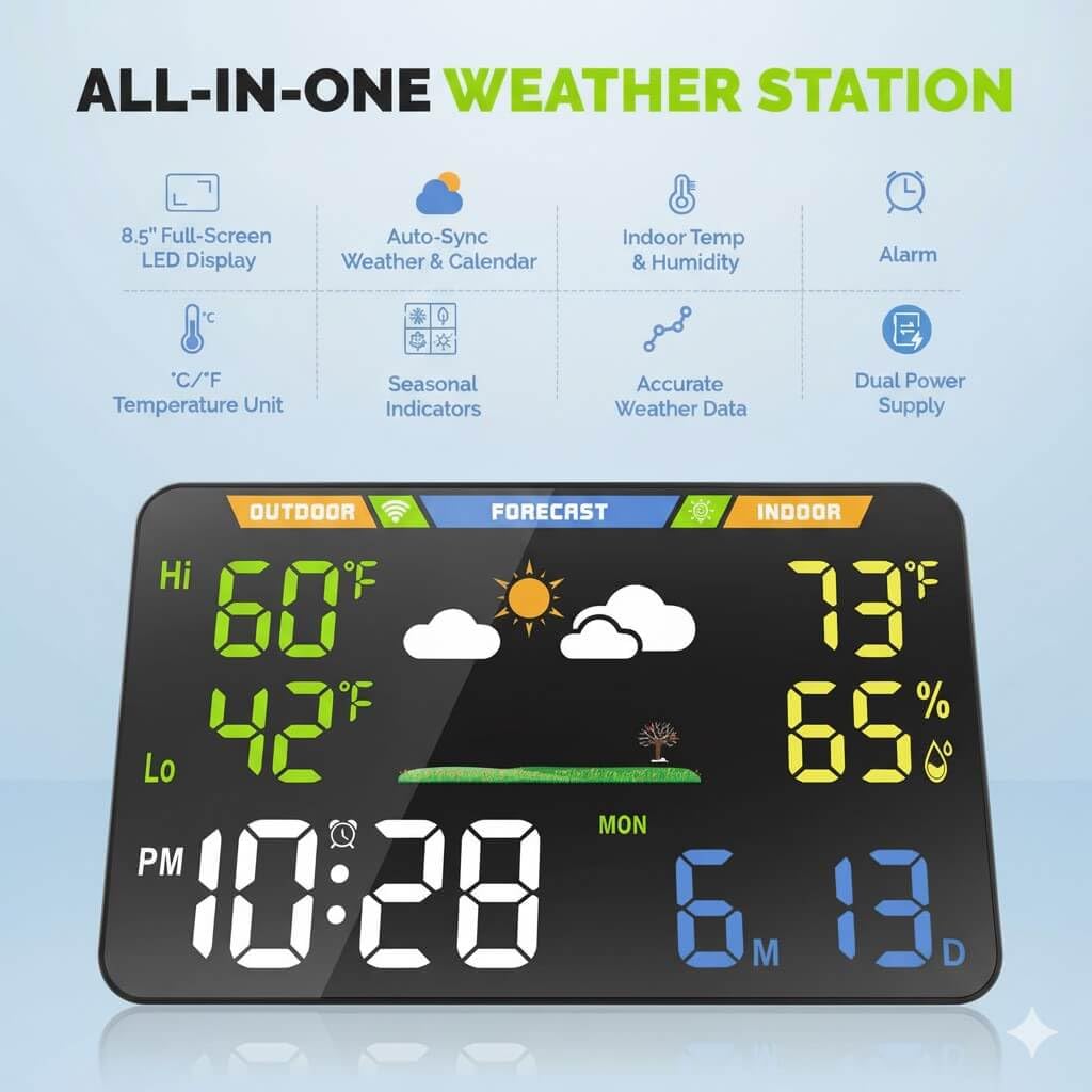 | Additional Features | Color LED Display, Internet-Synchronized Weather Forecast and Calendar, Indoor Temperature, Humidity, Alarm, seasonal indicators, Dual Power |
