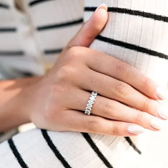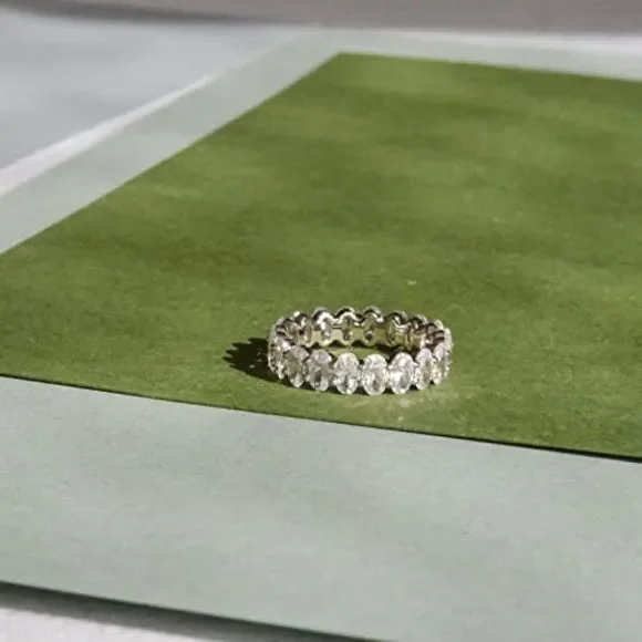 This timeless eternity ring features the boldness and intense sparkle of oval cut cubic zirconia gemstones. A classic, tailored shared prongs setting allows the maximum amount of the diamonds surface to show. This eternity band that oozes drama and excellence. The perfect addition to any engagement ring or to wear alone.Measurement - cz gemstone: 5*4mm (i.e. equivalent to 7 /12 carat diamond).Made to last - A thick layer of 18K gold plating over recycled brass. Tarnish-resistant, water-proof, nickel and lead free, hypoallergenic.