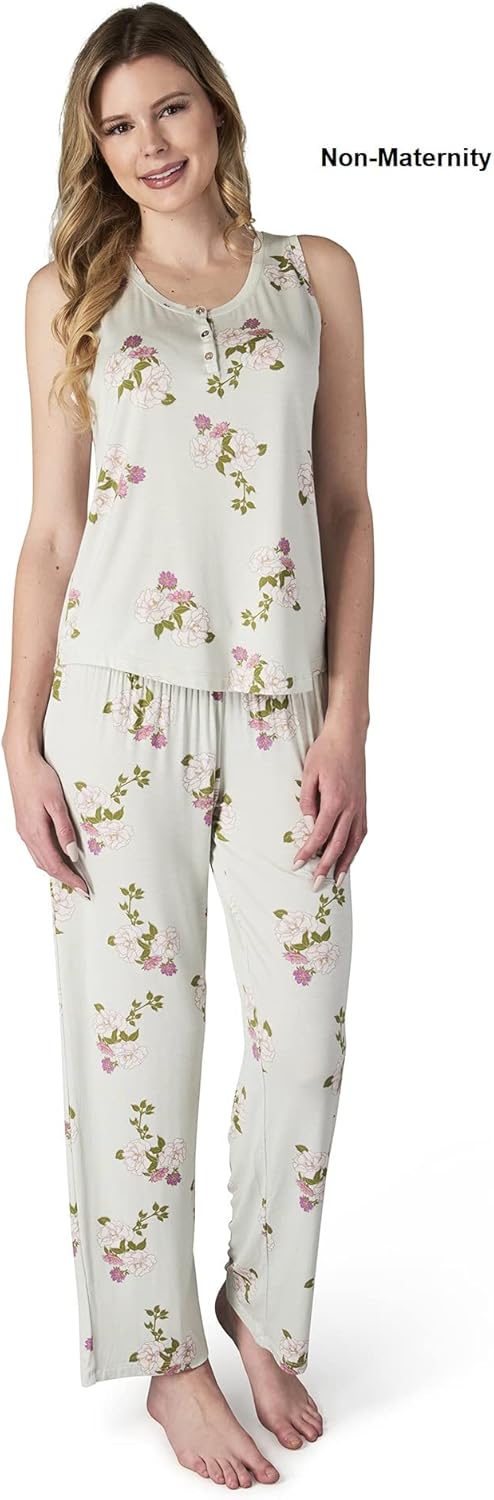Beautifully feminine, this 2-piece maternity and nursing PJ set is both chic sleepwear and lovely loungewear for those days when you can't quite seem to get dressed! Sewn from the softest knit jersey with a gorgeous drape, it includes a comfy pant with stretchy, smocked waistband that sits comfortably just under the belly, and a classic tank with curved hem and button-front placket for easy nursing access. Rayon/Spandex. Machine wash cold, gentle. Line dry or tumble dry low. High point shoulder to hem length is 25.5 inches for size Medium. Pant inseam is 29 inches for size Medium. Import.