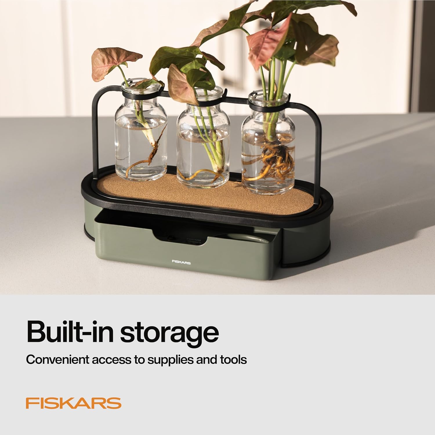 Love growing your plant collection from cuttings? With the Plant Propagation Station, root propagation reaches a new level of elegance and ease. It's never been simpler to put down roots and expand your indoor jungle. This stylish and functional system lets you easily turn cuttings into thriving new plants. Its compact design allows you to propagate three cuttings simultaneously, all while using a single light source – perfect for maximizing your space. The durable metal stand and storage base are as sturdy as they are chic, featuring a built-in steel tool and supply drawer with a durable powder coat finish. Stabilizing bottle stand works on its own – or can be placed on top of the included storage base.
