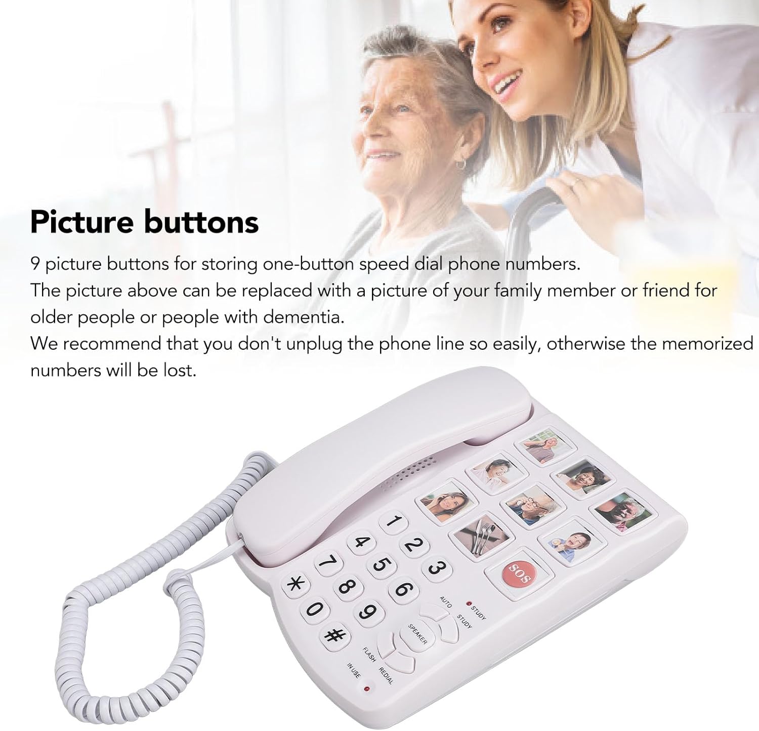 Spec: Item Type: Big Buttons Phone Material: ABS Color: White Remote Control Battery: Built in 2 x 75mAh CR2016 Buttons Cell Batteries (included) Function: 1. 8 groups of single key affection keys, picture one touch dialing 2. 3 groups of SOS key affection Buttons, picture one touch dialing (three groups of numbers can be manually cycled out) 3. Remote control SOS dialing function (three groups of numbers can be manually cycled out) 4. 10 sets of two key affection keys 5. One touch SOS dialing (user defined) 6. Indicator light function 7. Flash off function (FLASH) 8. Redial function: (REDIAL) 9. Handle handset volume three adjustable (large, medium, small three) (HI, MED, LO) 10. Ringer volume large, small, off three adjustable (large, small, off three) (HI, LO, OFF) Scope of application: for the family, for the elderly with impaired vision and hearing How to Use: Plug and play, refer to the instructions for use. packing list: 1 x Landline Telephone 1 x Handset 1 x Handset Cord 1 x US Phone Cord 1 x UK Phone Cord 1 x Remote Control 1 x Lanyard 1 x Instruction Manual Notice: It is normal for the number keys not to emit a signal sound when storing a phone number. This is the way the phone number is stored, not the behavior of the number keys not working.