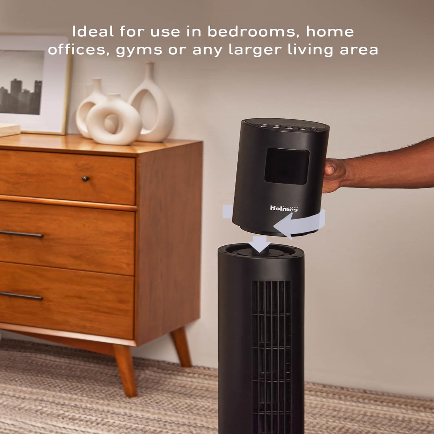 Holmes 31” Manual Tower Fan makes cooling your home a breeze. Features simple manual control knobs to easily operate the fan and adjust the settings. Small but powerful, it has 3 speed options, low, medium and high, and motorized 70° oscillation to deliver cool airflow for wider areas. Move the adjustable vents up and down for an even further customized cooling experience. This slim, compact tower fan is ideal for living areas where floor space is limited, including bedrooms, kitchens, living rooms and home offices, and has an integrated carry handle to go from one room to the next. Rest easy knowing there is an up to 2-hour auto shut-off timer to conveniently turn off the tower fan. This modern fan features a sturdy base, black finish and 3-year limited warranty.
