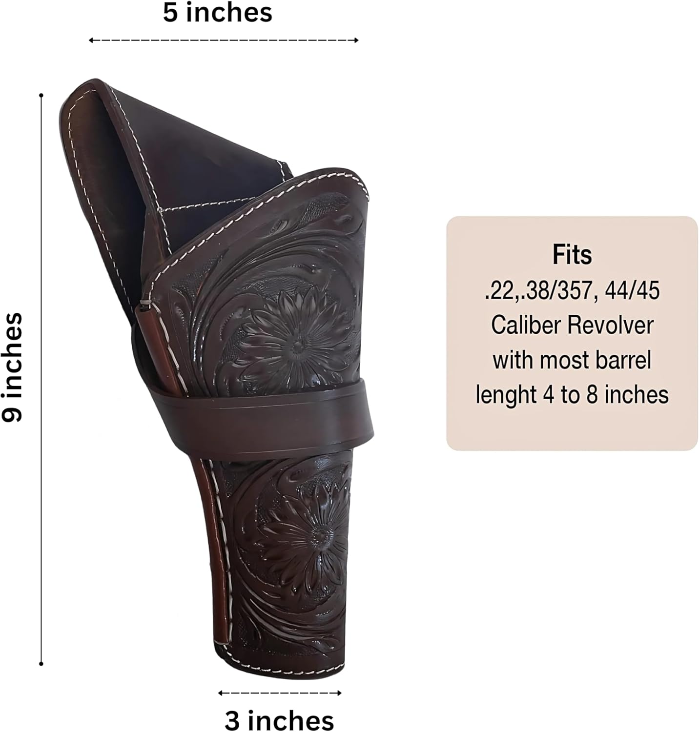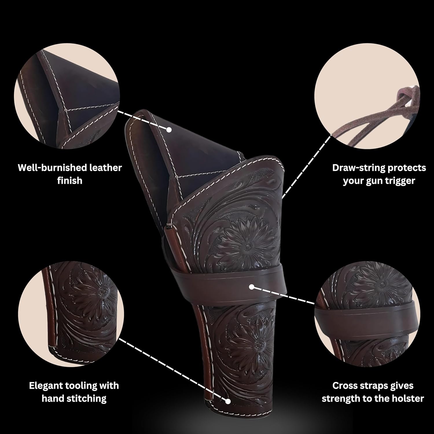Hulara Genuine Leather Western Revolver Holster and Slingshot Ammo Case Set. Expertly crafted from premium full-grain leather, this rugged and durable set is designed to fit revolvers ranging from 4-inch to 8-inch barrels, accommodating popular calibers like .22, .38, .357, .44, and .45. The classic cross draw holster offers secure and quick access, ideal for hunting, outdoor sports, or Western reenactments.