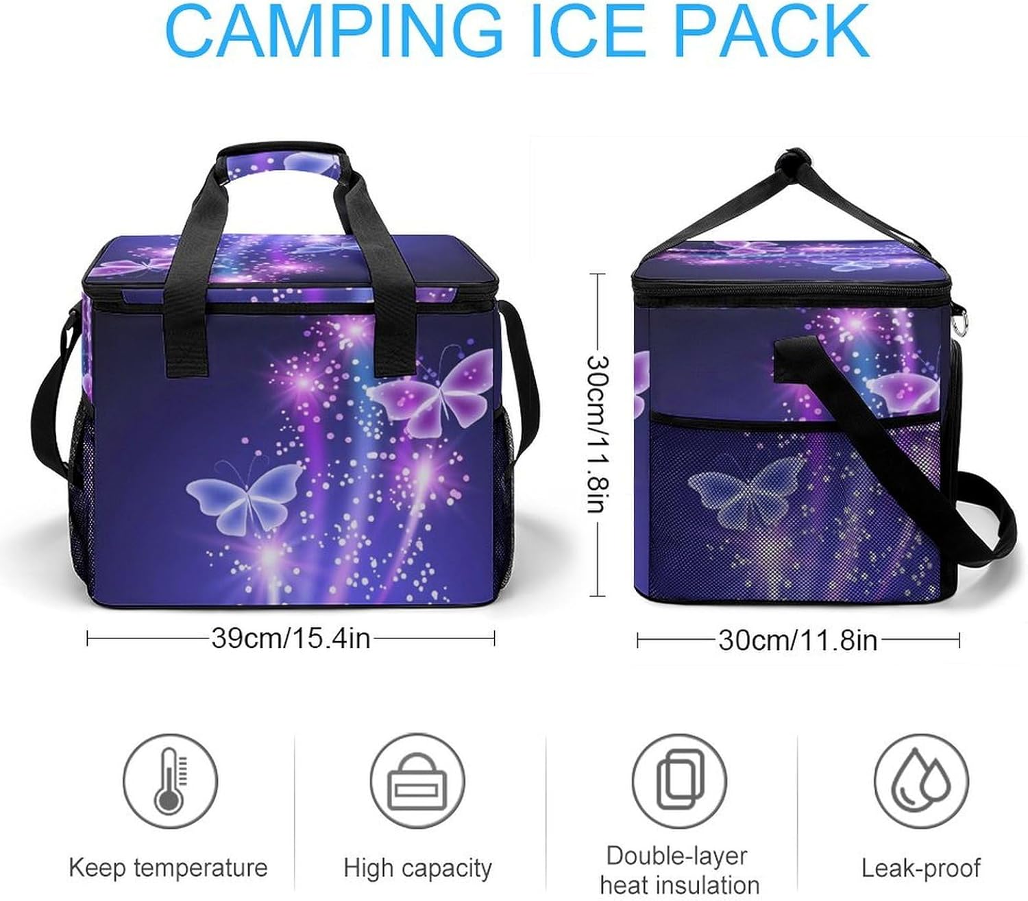 Take Your Meals Anywhere with Cute Purple Butterfly Grocery BagsFood Container Carrier Oxford Fabric Picnic Bag Heat Retaining Food Bag Camping Cooler BBQ Accessories Cute Picnic Bag with Pockets Insulated Food Bag for Work Insulated Lunch Tote Bag Camping BagTemperature Control That WorksThe upgraded aluminum foil lining creates an effective thermal barrier. Your drinks stay refreshingly cold, and your hot dishes maintain their warmth for hours. No more lukewarm meals during outdoor outings.Thoughtful Storage DesignTwo side mesh pockets - Perfect for water bottles or umbrellasFront zippered pocket - Keeps keys, phone, or condiments organizedInternal mesh pocket - Stores utensils, napkins, and small essentialsMain compartment - Spacious enough for food containers and snacksBuilt for Daily AdventuresConstructed from high-density oxford fabric with reinforced stitching at stress points. The double zippers are sturdy and smooth-operating. Reinforced handles let you carry heavy loads with confidence.Carry Your WayHandles for quick grabbingStands upright for easy packing and accessPerfect For:Picnics in the parkBeach days and pool partiesCamping and hiking tripsOutdoor concerts and festivalsDaily work lunchesGym and fitness classesRoad trips and travelGrocery shoppingSpecifications:Dimensions: 15.4 x 11.8 x 11.8 inchesMaterial: High-density Oxford fabricLining: Aluminum foil (insulated)Closure: Sturdy double zippersPockets: 2 side mesh, 1 front zipper, 1 internal meshCare: Hand wash or machine wash, do not bleachNote: Food containers and utensils shown in images are not included.
