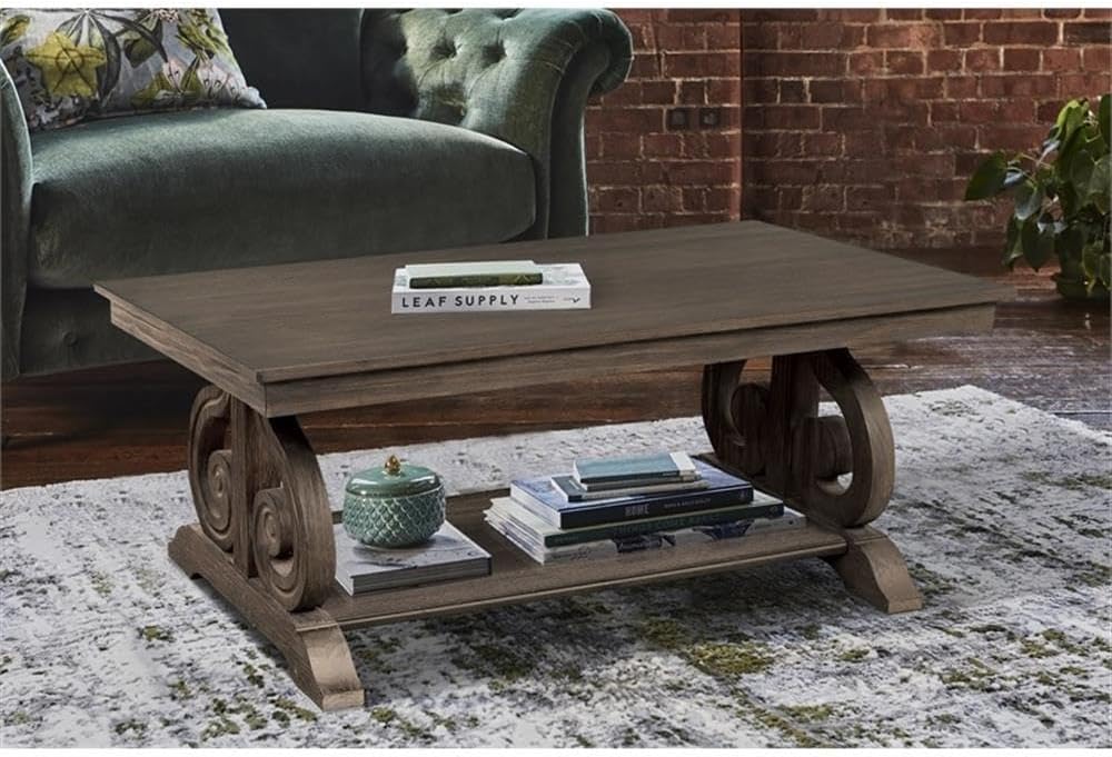 Bold curves provide elegant contrast to the unique look of the Toulon Collection. The heavily scrolled base supports of the cocktail table feature French provincial inspired routing while distressed dark oak finish provides texture to the acacia veneer. Crafted from acacia veneer, wood, and engineered wood, this table features a rich distressed dark oak finish that adds rustic charm to any space. A lower shelf offers convenient storage or display space. Assembly is required.Features:- Made of acacia veneer, wood and engineered wood- Distressed dark oak finish- Lower shelf- Assembly required- French Country styleSpecifications:- Product Dimensions: 19.00" H x 48.00" W x 26.00" D- Shelf Dimensions: 25x15.75x12 (1)- Product Weight: 60 lbs