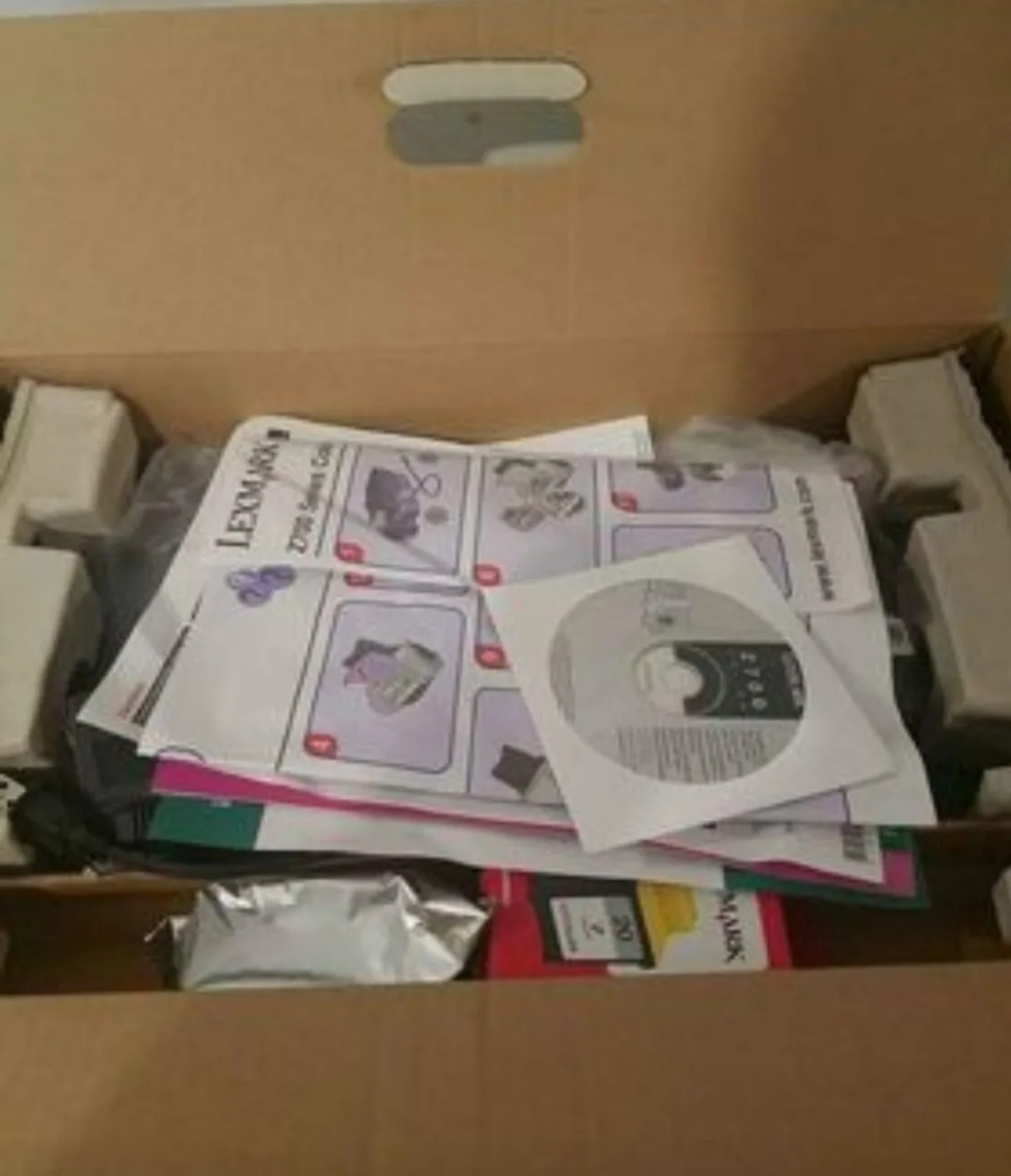 Introducing the Lexmark Z715 Series Inkjet Printer Photo Quality with ink, in an open box. This printer offers high-quality printing technology, making it perfect for all your printing needs. With its sleek design and reliable performance, you can trust this printer to deliver professional-grade prints every time.
