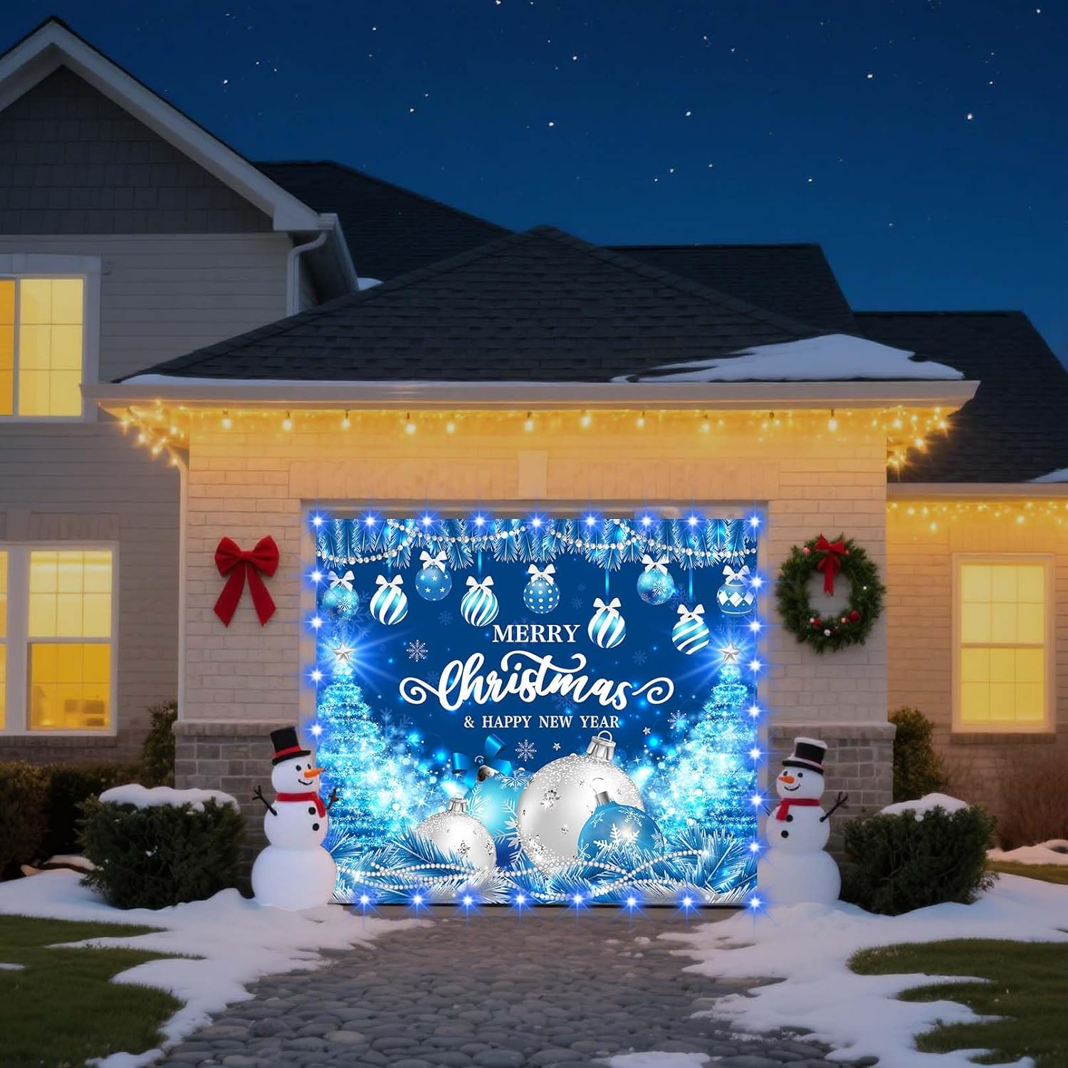 This blue light up merry Christmas banner for garage door isn’t just a decoration; it’s an experience. Imagine driving up to your house and being greeted by a beautiful, bright blue christmas banner that instantly puts everyone in a festive mood. Or picture the laughter and smiles at a holiday party where guests are taking pictures in front of it, creating memories that will last a lifetime. With its easy setup, durable quality, and classic design, this banner is the perfect finishing touch for your holiday preparations. Make your celebrations truly special this year and let our lighted Merry Christmas banner bring the holiday cheer home. Banner navideño grande iluminado (2,1 x 2,4 m): El gran tamaño del fondo navideño garantiza que cubra áreas extensas como puertas de garaje, cercas, paredes o incluso espacios interiores para eventos. El diseño es visible de cerca o de lejos, lo que lo hace adecuado para diversos entornos como hogares, oficinas, iglesias o reuniones comunitarias. La cubierta navideña para puerta de garaje con luces azules (requiere batería) es perfecta para fiestas en el jardín, eventos corporativos o incluso como fondo navideño para reuniones familiares. Bonito fondo navideño para fotos de puerta de garaje: El banner navideño para puerta de garaje para exteriores tiene un tamaño llamativo y un diseño encantador que lo convierte en un excelente fondo azul para fotografías navideñas para capturar recuerdos navideños. Ya sea para reuniones familiares, fiestas navideñas o simplemente para tomar fotos divertidas, el elegante fondo azul con elementos navideños clásicos añade un toque mágico a cada imagen. El fondo para fiestas navideñas es una excelente manera de hacer que esos momentos especiales sean inolvidables.