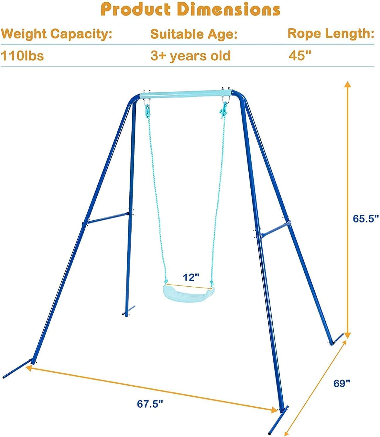 Description: Made from heavy-duty steel tubing, this children's A-swing frame comes with 4 ground spikes and is fixed to the ground with a hammer or cement for stability. The smooth seat is secured with high quality PE rope, the seat is spacious and the rope height is freely adjustable for children of all ages. This outdoor swing is suitable for use in courtyards, gardens, playgrounds and other environments, giving children a happy and relaxed childhood. Features: Heavy duty A-frame swing set made from sturdy iron tubing Supplied with 4 ground spikes, which can be fixed to the ground with a hammer or cement High quality PE rope fixing for safety and non-fading U-shaped seat area is spacious and safe at the same time The length of the rope can be adjusted according to the child's height Rust-proof metal material for outdoor use Quick and easy to set up for a stable swing Specifications: Color: Blue Material: Iron + PE Overall Product Dimension: 67.5" x 69" x 65.5" (L x W x H) Seat Product Dimension: 12" x 6.5" (L x W) Net Weight: 18.5 lbs Maximum Weight: 110lbs Recommended Age: 3+ years old Package Includes: 1 x Outdoor Swing Frame 1 x Belt Seat 4 x Ground Stakes 1 x User manual
