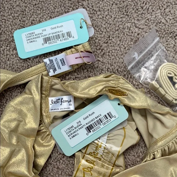 Luli Fama Cosita Buena Underwire Push Up Bandeau Top And Scrunch Panty Ruched Back Brazilian Bottom Bikini Size XSIncludes Top And Bottom, Both Size XSBrand New Condition With Tags Attached Dive into luxury with Luli Fama's gold bikini, designed to make a statement at the beach. This stunning swimwear piece combines elegance and style, ensuring you shine under the sun. Perfect for those who want to stand out with a touch of glamour.