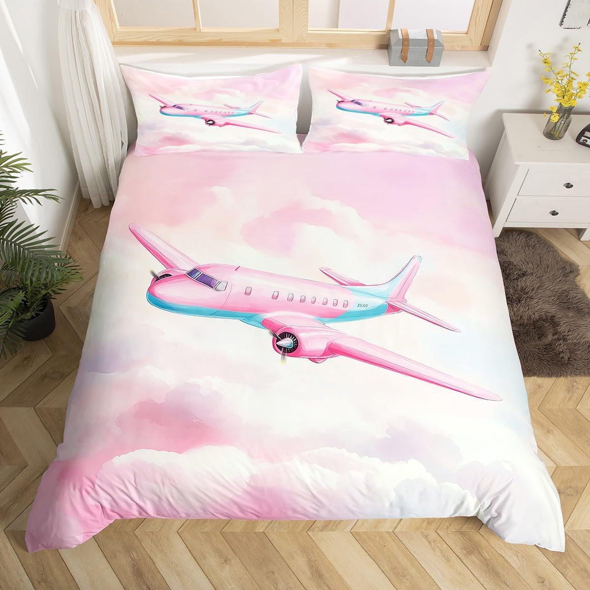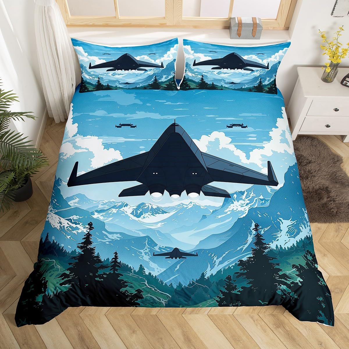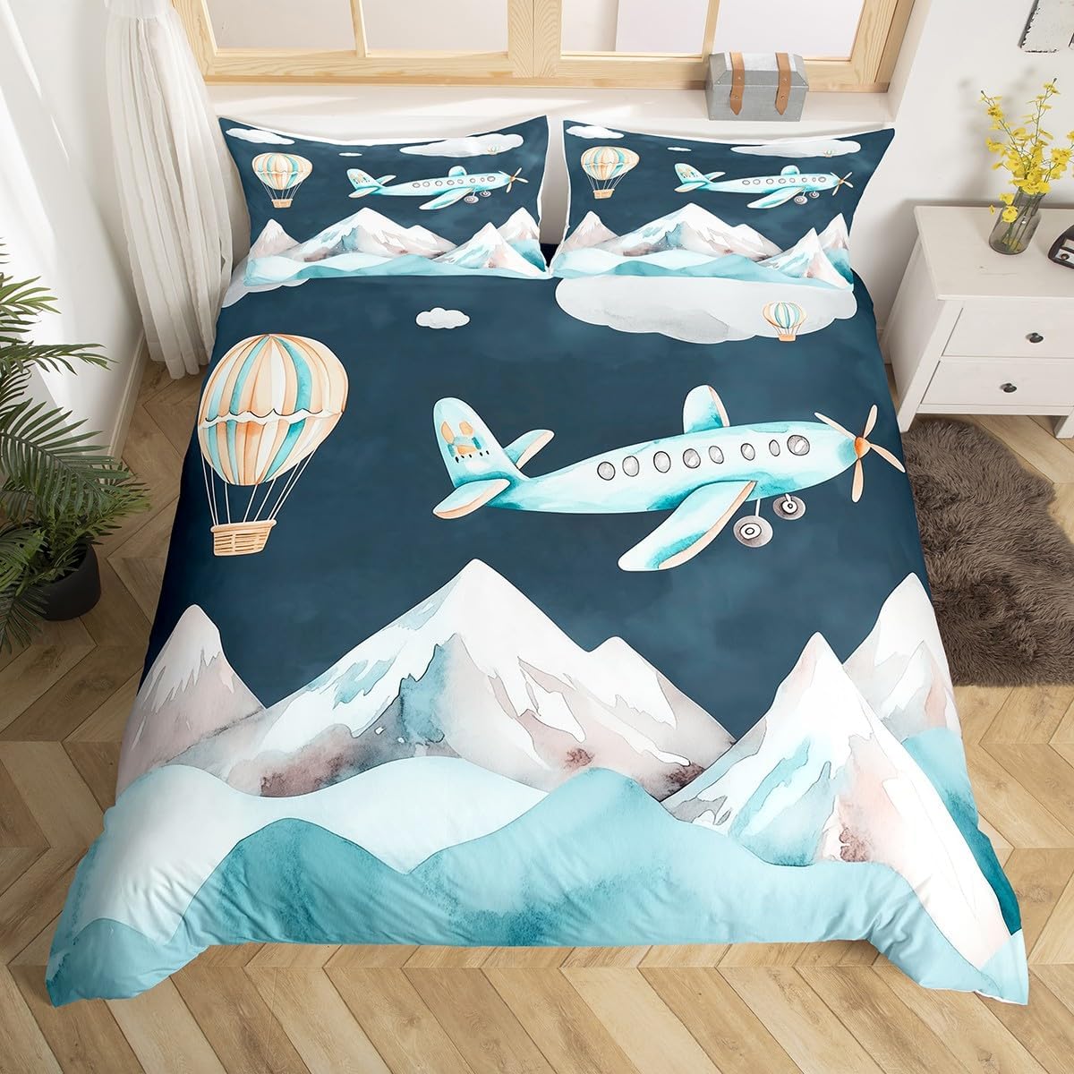 Manfei Airplane Duvet Cover,Sky Clouds Stars Aircraft Graffiti Duvet Cover for Kids Boys Girls Teens,Kids Boys Aviation Plane Cartoon Bedroom Decor Comforter Cover(No Filler) Full
