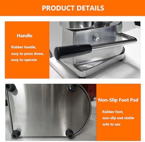 Introducing our versatile Manual Hamburger Press, designed for both home cooks and professional chefs. This innovative 3-in-1 burger forming machine allows you to effortlessly create patties in three sizes: 4-inch, 5-inch, and 6-inch. Whether you're grilling sliders for a casual get-together or crafting gourmet burgers for special events, this manual patty maker meets all your culinary needs. Equipped with non-slip rubber feet, our hamburger press provides stability during use, ensuring a consistent shape every time. The included 500 separation papers make stacking and storing your patties a breeze, enhancing your meal prep efficiency. Constructed from durable stainless steel, this burger and meat processor is not only easy to clean but also built to withstand the rigors of busy kitchens and restaurants. With dimensions of 23x16.5x26.5 cm and a handle length of 26.5 cm, its compact design fits seamlessly into any kitchen space. Weighing between 4.2 kg and 4.8 kg, depending on the size, it offers a sturdy feel without being overly heavy. This versatile tool is not just for burgers; it’s also perfect for making meat patties, sliders, or even milk tofu, expanding your culinary possibilities. Elevate your cooking experience and impress your guests with perfectly shaped patties every time. Ideal for family dinners, BBQs, or meal prepping, our Manual Hamburger Press is a must-have addition to your kitchen toolkit.