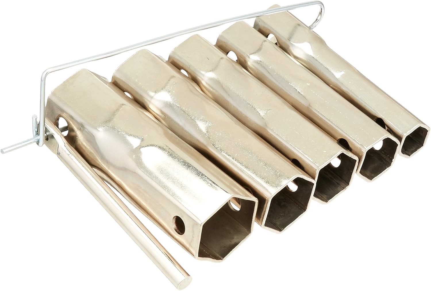 Mintcraft T141-3L Shower Valve Socket Wrench 7 Piece has a nickel plated steel body. Deep socket for easy access to recessed valve stems in tile wall. Bar handle and wire holder for easy storage. Includes five wrenches of sizes: 2-1/32 Inch x 2-7/32 Inch, 29/32 Inch x 3-1/32 Inch, 1- 1/32 Inch x 1- 3/32 Inch, 1- 5/32 Inch x 1- 9/32 Inch and 1- 11/32 Inch x 1- 7/16 Inch.
