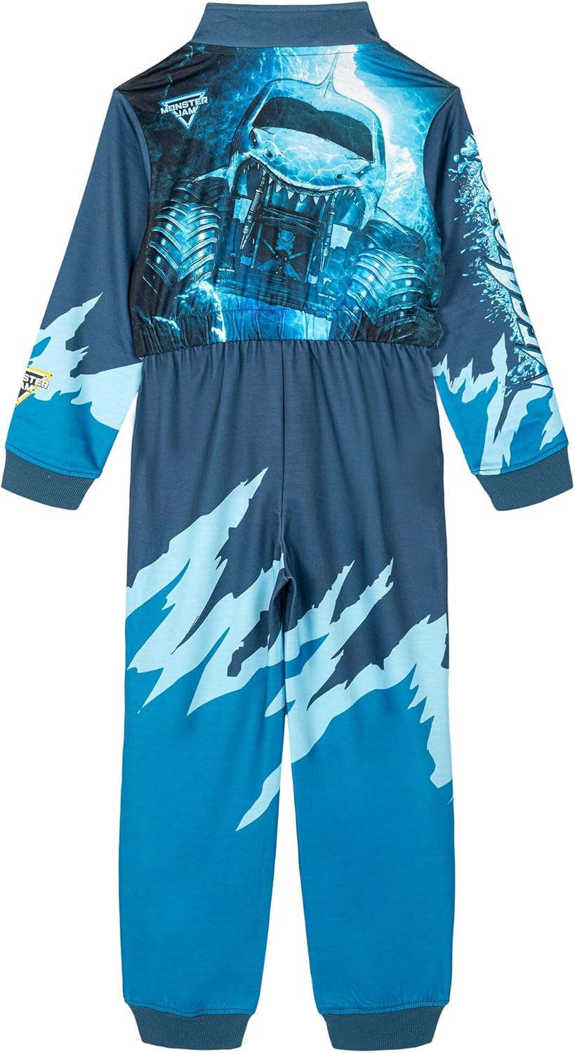 Gear up for nonstop fun in this officially licensed Monster Jam Grave Digger, Megalodon, El Toro Loco, or Sparkle Smash racing coverall. Styled like a real race car driver's suit, this zip-up one-piece features bold graphics, ribbed cuffs, and a mock neck for extra flair. Made from soft, durable fabric, it’s built for movement and imagination—perfect for playtime, dress-up, or cozy Halloween nights with big truck energy.