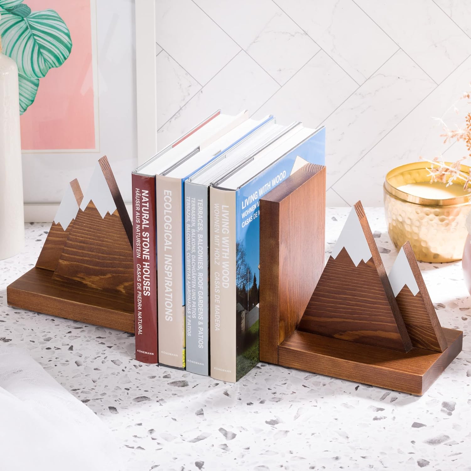 Premium Finish: Wood bookends are hand stained and sealed with a protective varnish to bring out their natural wood grain texture. Ideal bookends for kids. They look great in any room lighting - dark or bright. Crisp white mountain snow peaks are painted on both sides.Sturdy And Durable: The decorative bookends are hand crafted using thick, high quality pine wood for extra weight and durability. Each mountain peak piece is securely attached to the bookend base using premium grade furniture screws. The wood has a protective finish to ensure your bookends will look great for years to come.Rustic Adventure Decor: Woodland decor, woodsy decor for boys. Add an adventure feel to your study or home office bookcase. The beautiful hand stained finish will look great with most room color themes. The durable build and non-slip feet make it practical as well. Perfect as a cabin decor item.Woodland Nursery Decor: Perfect as a forest nursery decor item, on a mountain shelf or next to other mountain wall decor. Cute bookends for kids room. Also ideal for schools as a forest classroom decor or mountain classroom decor item.Non-slip Silicon Feet:. 4 protective silicon feet attached to each bookend prevent slipping or skidding when holding up heavier books. They also prevent any scratches to your bookshelf surface.A Perfect Gift: Birthdays, holidays, and mountain baby shower decorations.