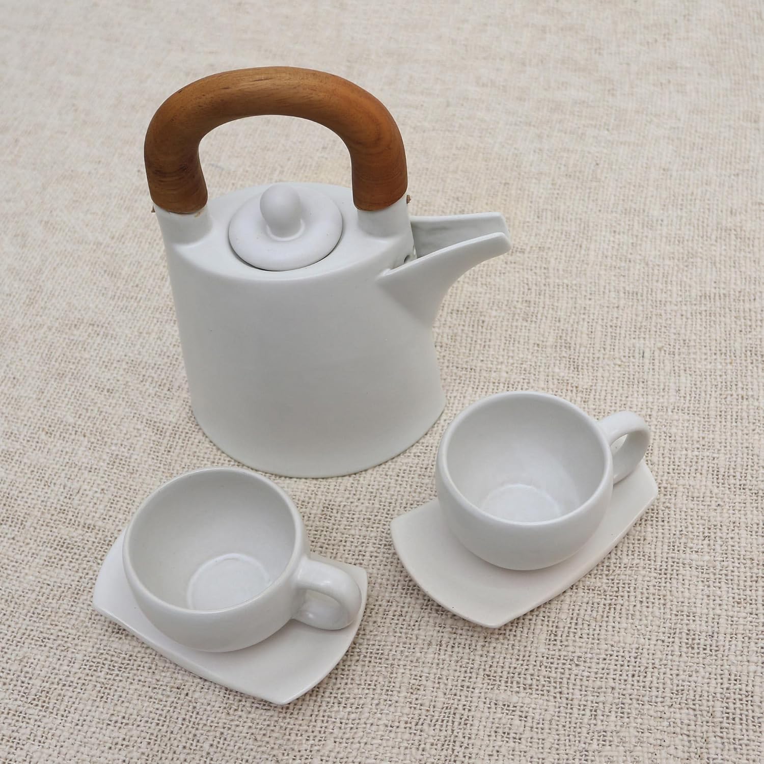 Novica works together with talented artists, artisans, and designers around the world to produce stunning, keepsake handmade treasures.About this item: This elegant contemporary tea set is designed and crafted by Bali's Nyoman Suarmini. The teapot, cups and saucers are crafted of ceramic with a stylish matte white glaze. The teapot boasts a sturdy handle crafted from teak wood. Enjoy a teatime tete-a-tete with this sleek ensemble.Hand wash onlyHand-crafted item -- color, size and/or motif may vary slightlyFood safeAbout our Artist: My name is Nyoman Suarmini. I was born in 1979 in a small village called Tejakula, Buleleng, Bali. Tejakula was away from the city crowds, and mostly the people worked as farmers, including my parents. My parents owned land with mango trees and also rambutan fruit trees. When the mangos were ripe, I used to wake up in the morning to help my parents harvest the fruit and then sell them to the nearest traditional market. I spent my hood playing with my older siblings. I am the youngest of 3 . We usually played in a field and searched for fruit. There are many more than mango and rambutan trees, but what I loved was grapes. I was never away from my village until I finished my senior high school, then I moved to Ubud. I worked in a ceramic shop when I was around 20 years old. There was one person who taught me to make ceramics, and told me that ceramics will never go out of style.Now I own a shop which sells ceramics; there are teapots, oil burners, and even incense holders. I love making and selling ceramics because I can also contribute to my society and community. I can provide incense holders to pray, since I am Balinese and we pray using incense. I can also provide bowls as the place for holy water that will be used for traditional ceremonies. And the clay is safe for the environment. My motifs are mostly leaves and jepun flowers (frangipani), since