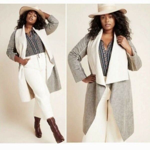 Sherpa lined. Flattering, asymmetric hem. Long sleeve. Shawl collar. Open, no closure. Wrap to wear. Perfect for casual, travel, or work etc. Jacket is ready to ship!