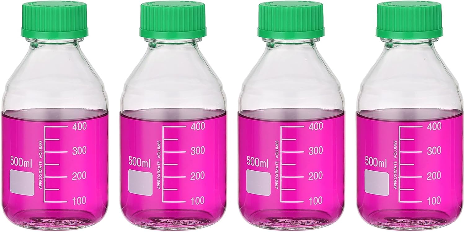 Leakproof: Our Media Storage Bottles are designed with a smooth bottle mouth that perfectly fits the GL32 screw cap, ensuring a tight and secure seal. This leakproof feature prevents any liquid from spilling or leaking out of the bottle, minimizing the risk of evaporation and exposure to external elements.Easy to Read: Package includes 4 pack Media Storage Bottles with a capacity of 100ml, featuring a graduated white printed scale, providing precise measurement and accurate volume readings. The smooth surface of the bottle allows for easy cleaning and ensures clear visibility during experiments or storage.Durable Material: Made from borosilicate glass, which is excellent durability and heat-resistance. They are chemically resistant and maintain their transparency even after repeated use. The thickened bottom adds to their durability and ensures long-lasting performance.Large Marking Area: These bottles are suitable for storing media, reagents, and other liquid solutions in laboratory, experimental, or home settings. The large marking area allows for easy identification and labeling of contents, facilitating efficient organization and retrieval.Screw Cap: The screw caps of our Media Storage Bottles are made from durable polypropylene (PP). They exhibit excellent resistance to high temperatures and corrosion, with a maximum temperature tolerance of 140 degrees Celsius. The secure screw cap design ensures airtight sealing and protection of stored liquids.