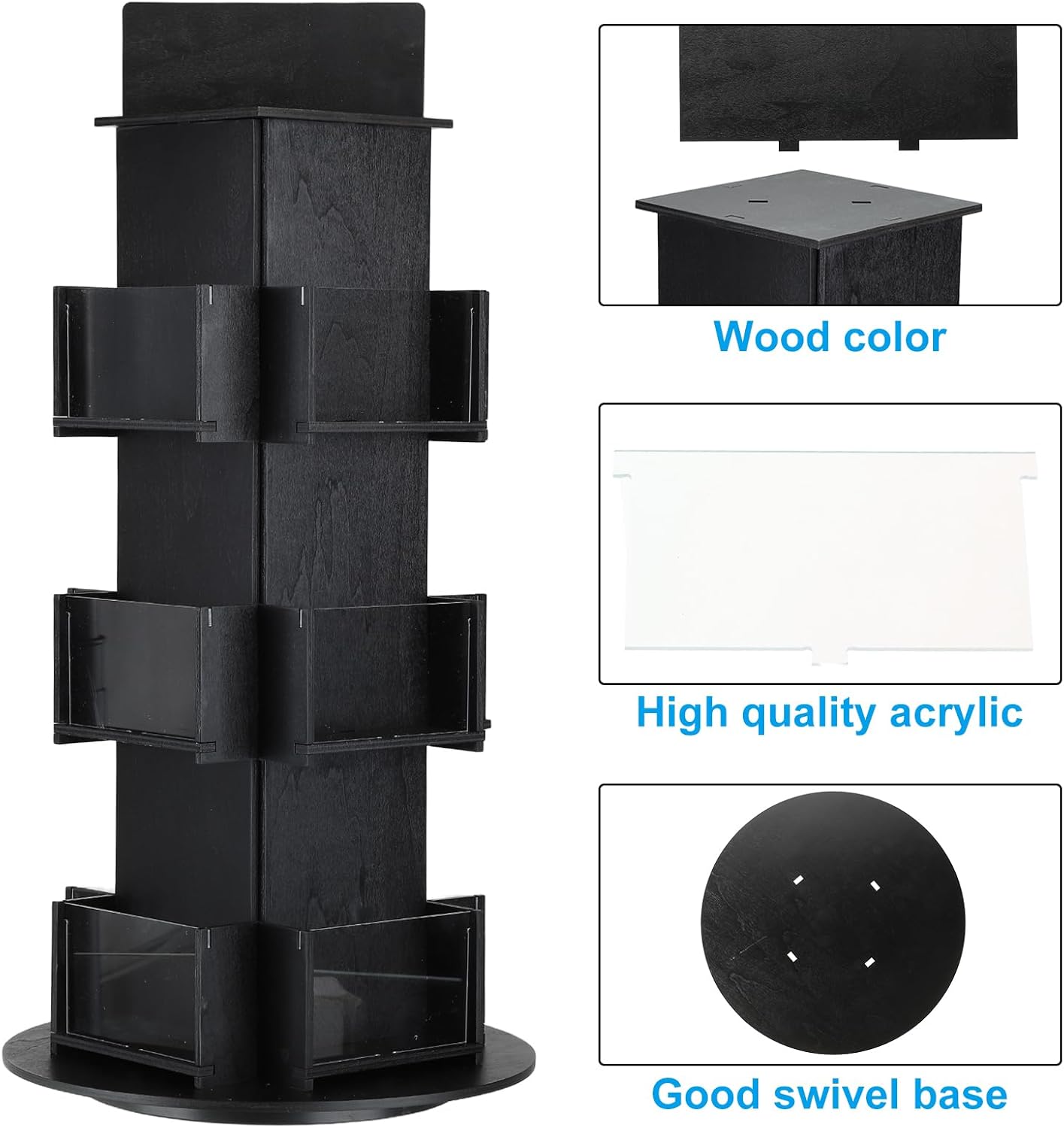 • Specification: Color: Black; Material: Wood;; Size: 38 x 23 x 51cm / 15 x 9 x 20 inch ( L * W * H ); Packing List: 1x Rotating Wooden Display Rack