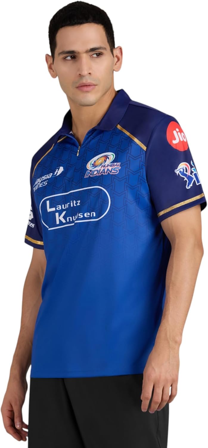 Step into match-day energy with the Mumbai Indians Men’s Fan Jersey, designed for fans who want iconic MI style at unbeatable value. Featuring the team’s signature blue with elegant gold piping, this jersey delivers a clean, modern look without compromising on comfort.Made from lightweight, breathable fabric and finished with a smart collar, it’s perfect for stadium days, watch parties, or everyday wear. With simplified sponsor detailing and premium construction, this fan jersey brings the spirit of the champions—at a price every fan can celebrate.Jersey Inspiration NoteThe design of this jersey is inspired by the letter “M,” developed as a repeating pattern to create rhythm and continuity across the print. The “M” represents MI’s mindset, mentality, and momentum, reflecting focus and a forward driving spirit. Transforming a single letter into a unified pattern expresses the collective strength that emerges when the team and its supporters come together.