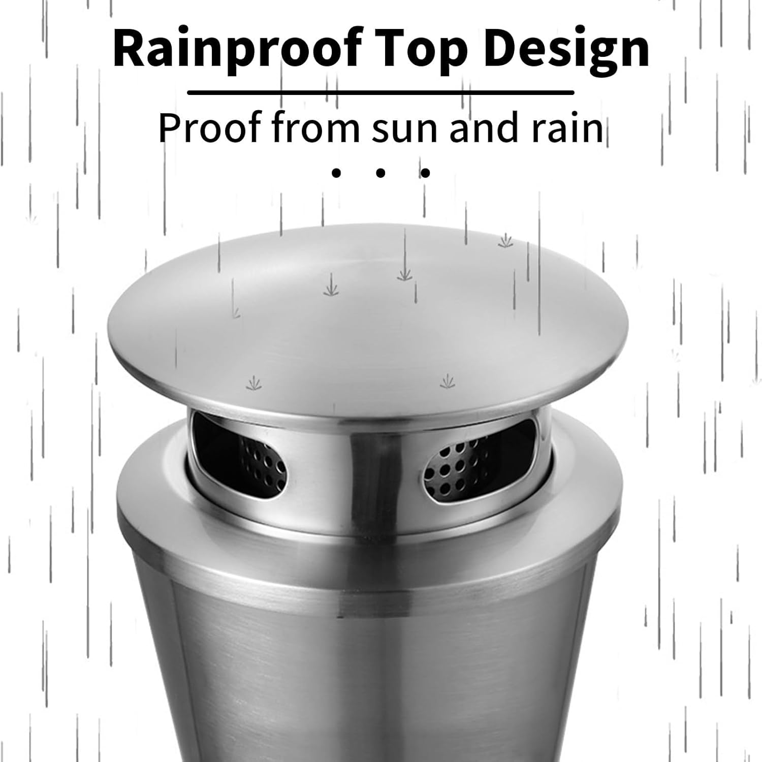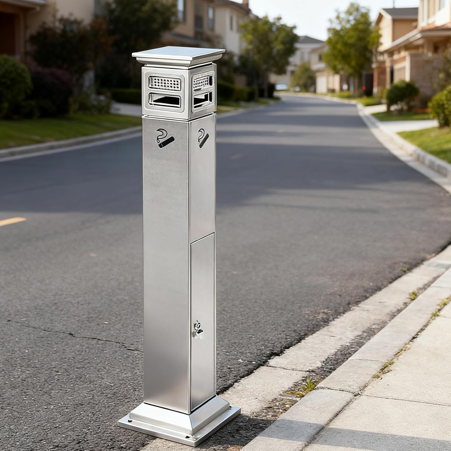 This floor-standing outdoor ashtray is crafted from high-quality stainless steel, featuring a durable and rust-resistant construction that stands up to daily use and outdoor environmental elements. Its robust build ensures long-term reliability, making it a practical choice for both residential and commercial settingsIt comes with a removable inner bucket that simplifies cleaning—just take it out, empty, and wipe clean without extra hassle. The large-capacity design reduces the frequency of emptying, saving time and effort for users, especially in high-traffic areaThe bottom is equipped with a rubber ring to protect floors, decks, or tiles from scratches and scuffs during movement. For enhanced stability and to prevent tipping, you can open the lid, remove the inner bucket, and fill the base with sand or similar materials, ensuring it stays securely in place even in busy spaces or mild windsFeaturing a rainproof top and all-round cigarette butt extinguishing design, it effectively keeps internal contents dry in wet weather and maintains a neat appearance. The sleek silver finish blends seamlessly with various decors, from modern office lobbies to elegant hotel courtyards. It includes essential accessories for easy setup and is suitable for star-rated hotels, office buildings, shopping malls, clubs, supermarkets, banks, and garden areasIts humanized height is designed to fit most users’ habits, allowing for convenient cigarette butt disposal without bending over. The smooth surface is easy to wipe down, resisting smudges and maintaining a polished look even with frequent use. It also plays a role in guiding civilized disposal, helping keep public and private spaces free of scattered butts and promoting a cleaner environment. Additionally, the material ensures it’s safe for use around people and pets in daily scenarios
