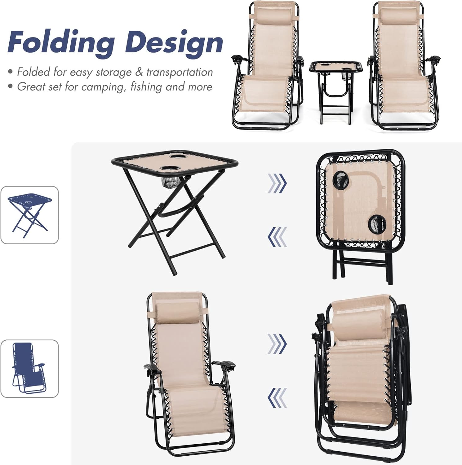 | Included Components | 1 x Portable folding table, 2 x Chaise lounge |