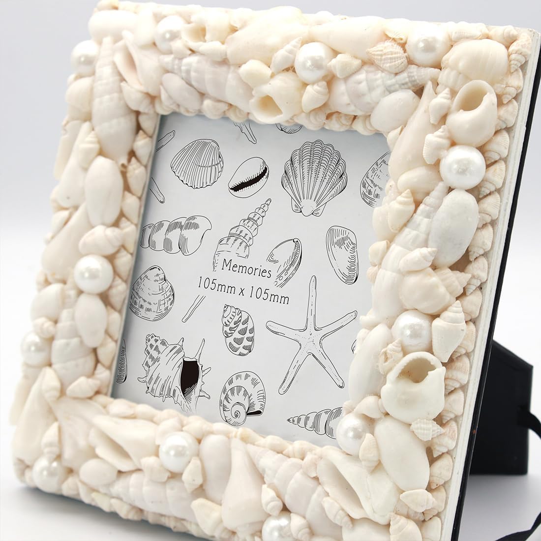 Fresh frame with shell or bead design A beautifully arranged photo frame with a beach inspired shell. Decorate your room with your loved one, pet or a memorable landscape with your favorite photo. Because it is a natural material, it has a unique smell. If you are concerned about the smell, please put it in a well-ventilated place for a little more relaxation. Please note that the shape and size may vary slightly due to the use of natural shell.