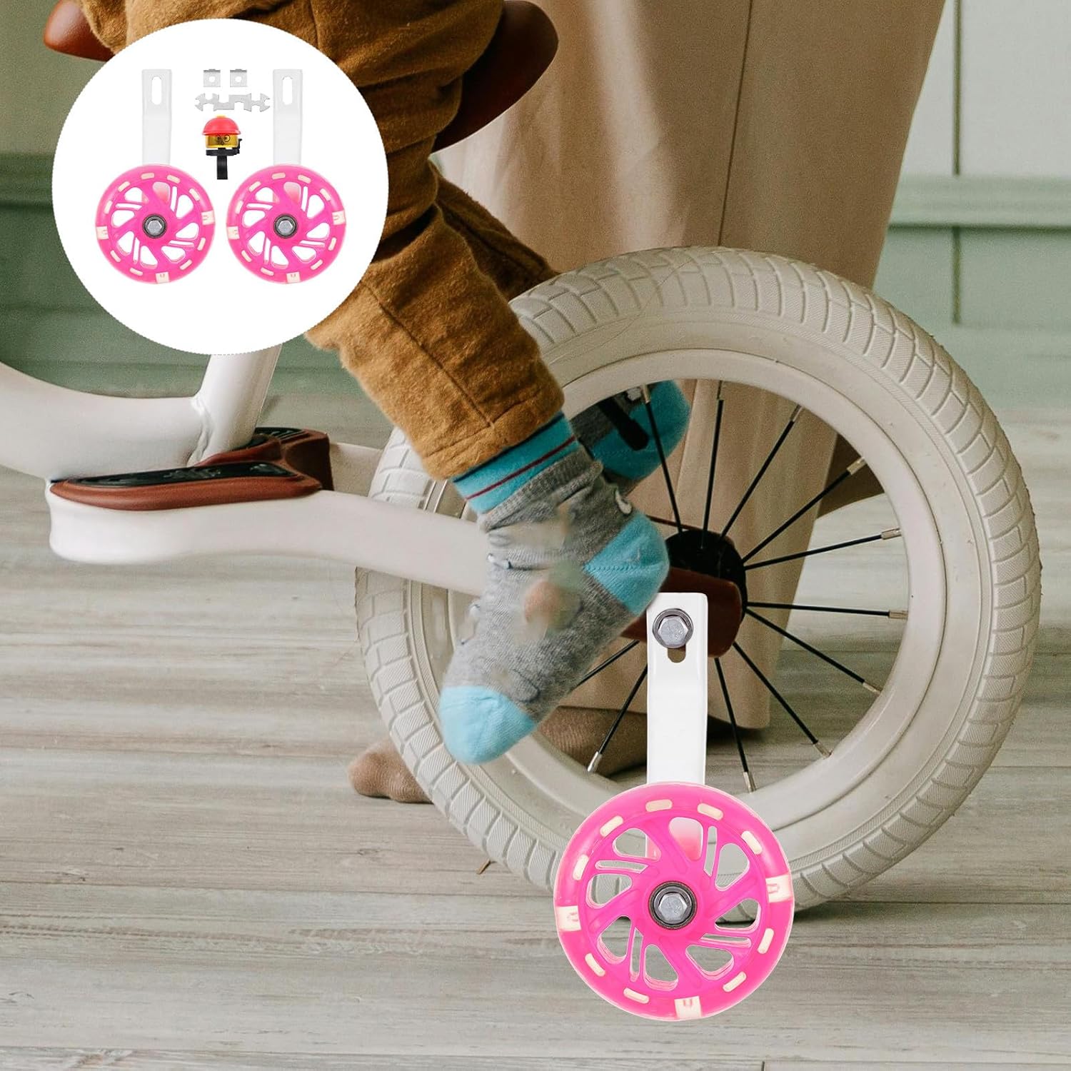 Package List 1 Set Wheel Characteristics -Product Info:Auxiliary wheel -Color: Pink. -Size: 11x11x2cm/4.3x4.3x0.8inch. -Material: PU, carbon steel. - Unique design can give your the best start with two-wheel balance and confidence Training Wheels. - Made of , environmental friendly and high strength materials, durable and safe. - Comes with necessary tools, easy to assemble Bike Stabilizer Wheels. - Perfect accessories for those who are not skilled at cycling or afraid of falling. - It can flash light when rolling, very fantastic and funny.Goods DescriptionTraining Wheels The supporting wheels are sturdy and adjustable, providing the necessary safety and stability.Bike Auxiliary Wheels This is a set of bike training wheels which are made of high strength materials.Bike Stabilizer Wheels It can give your the best start with two-wheel balance and confidence