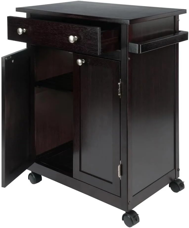 This is a piece that combines appeal and functionality and is certain to complement your home decor. With a full unit-wide drawer with , brushed silver drawer knobs that provides maximum space for silverware, and accessories. The convenient wooden push handle on the side was designed for hanging kitchen towels. Add a contemporary feel and storage to your workspace in the den, dining room or kitchen with this cabinet finished in a dark espresso. Keep dishes and glassware handy in the enclosed cabinet space that features a wood slat middle shelf, with space for canisters, cookbooks and more. Keep the cart in place or roll it out to the dining room and use as a serving cart when guests are over. Four Rolling casters, two of which lock to keep the unit stable while in use, allow for easily mobility when needing to move or take into another room. apartments or kitchens with limited space as this cart has ample surface for meal prepping and with plenty of storage opportunities below. Assembly required.Description:Crafted from solid wood in espresso finishFeatures 2 drawers for storageComes with 4 casters for easy mobilityaddition to your kitchen; some assembly requiredDimensions: 26.89W x 17.72D x 34.02H in.Package: 1 x Kitchen Cart (Does not include other demo goods)1. Due to light and screen differences, the color may be slightly different from the picture.2. Due to manual measurement, please allow 1-3 cm difference.3. Thank you for your understanding.assembly—just follow the instructions.