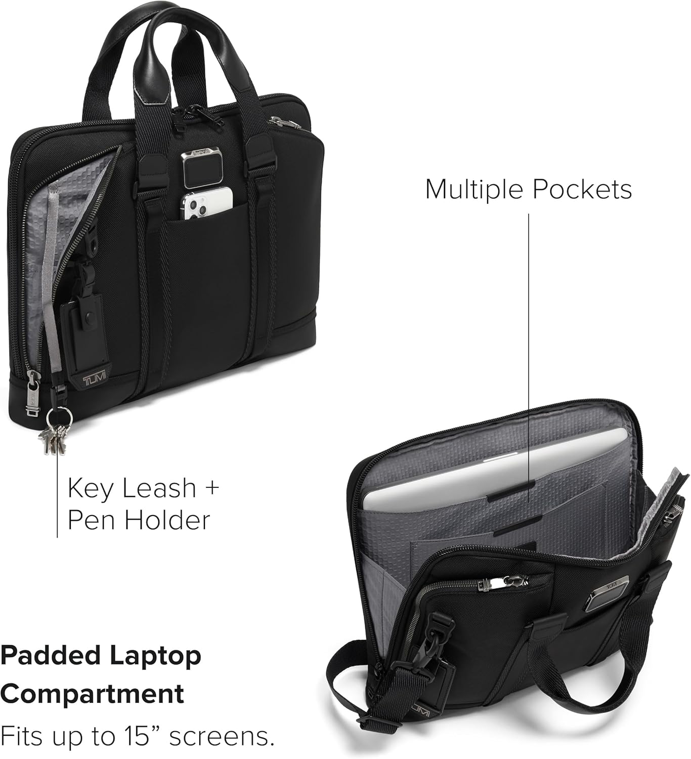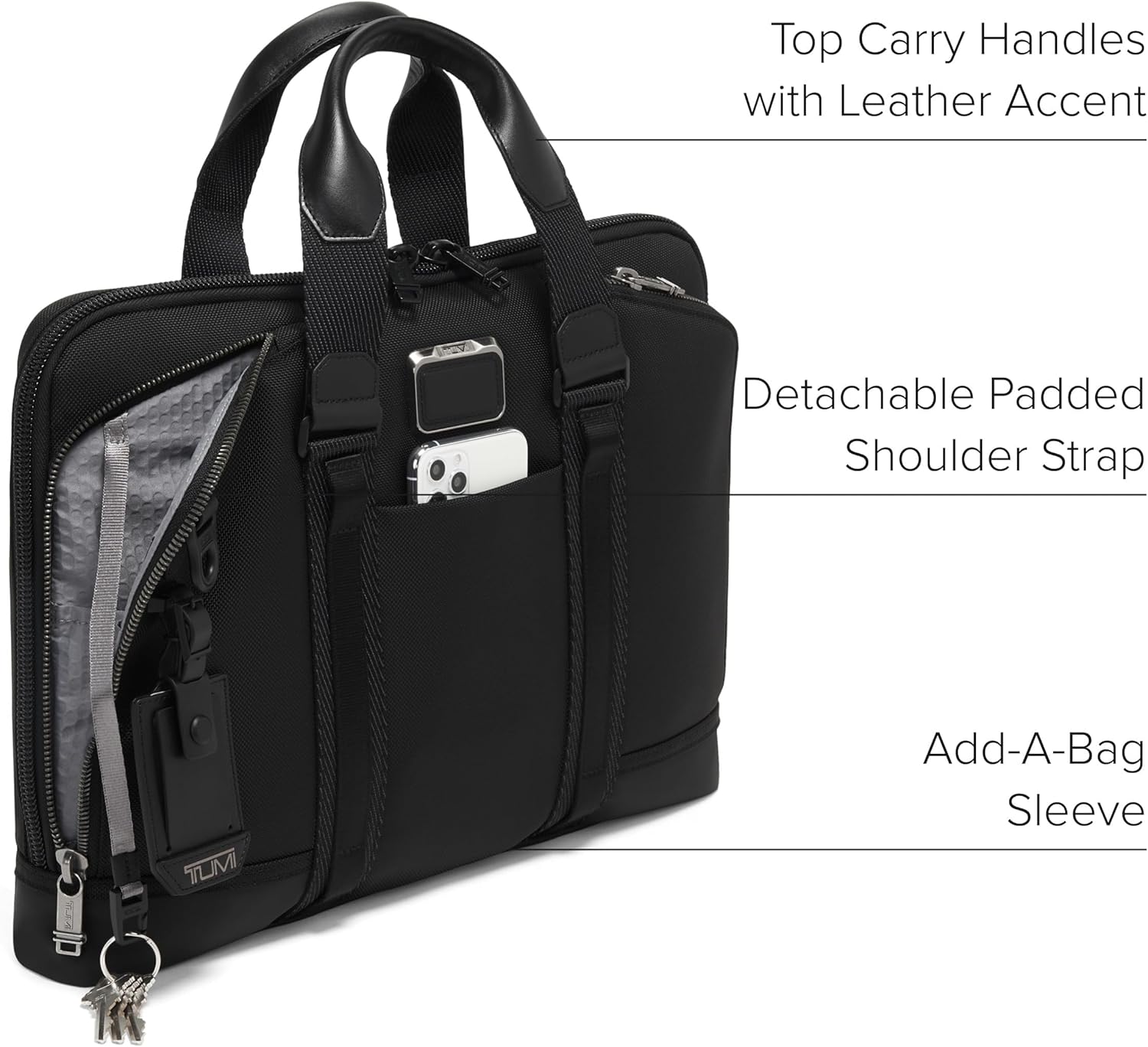 Travel comfortably and in style with the TUMI Alpha Bravo Academy Briefcase, the quintessential briefcase for those who value form and function. This slim briefcase is designed to carry all your daily essentials, including your laptop and tablet, in a sleek and organized fashion. The dedicated padded compartments make it an ideal laptop bag for the professional on the go, ensuring your electronics are safely stowed and easily accessible.Crafted for durability and ease, this bag is a versatile companion for your travels, whether heading to the office or embarking on a business trip. The Alpha Bravo Academy features an array of pockets, becoming an indispensable briefcase organizer for your trip essentials for vacation or work. With a removable shoulder strap and comfortable leather-accented handles, this laptop travel bag offers multiple carrying options to suit your style and needs. The exterior includes front daisy chains compatible with TUMI+, while the Add-A-Bag sleeve smoothly slides over your luggage for a hassle-free journey.In the interior, a padded laptop compartment (fits up to a 15” PC or 16” MacBook screen), TUMI Tracer, key leash, and various pockets make this briefcase the perfect bag for the professional on-the-go.We design for you. Our commitment to exceptional quality and high performing products have made TUMI the leading lifestyle and accessories brand that travelers depend on consistently. This is what we call the TUMI Difference.By putting excellence and quality first, we are committed to creating quality TUMI products that have lifelong purpose, are supported by our rigorous testing standards, use recycled materials and our global repair network.