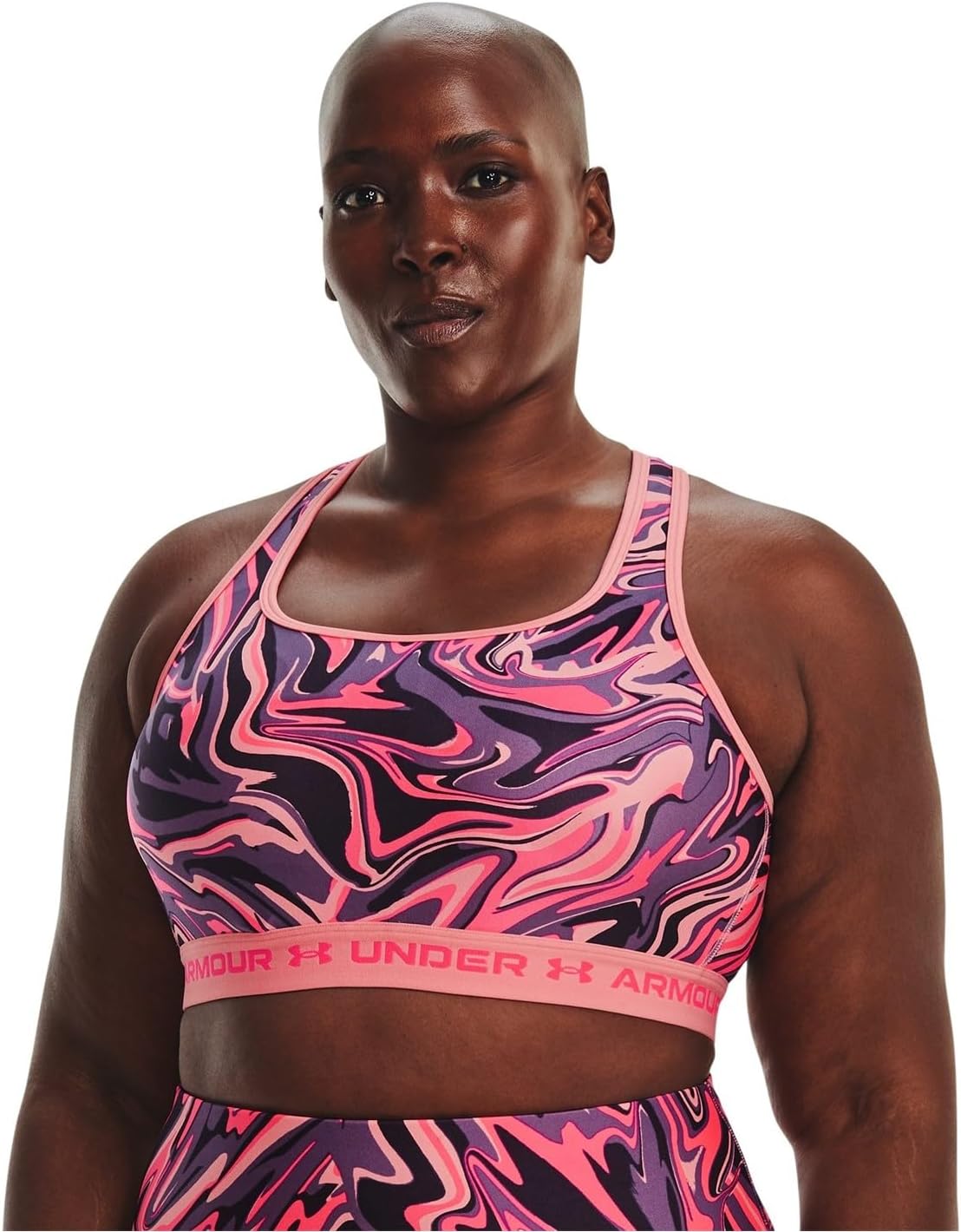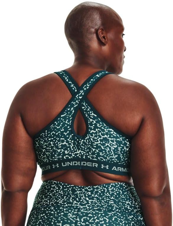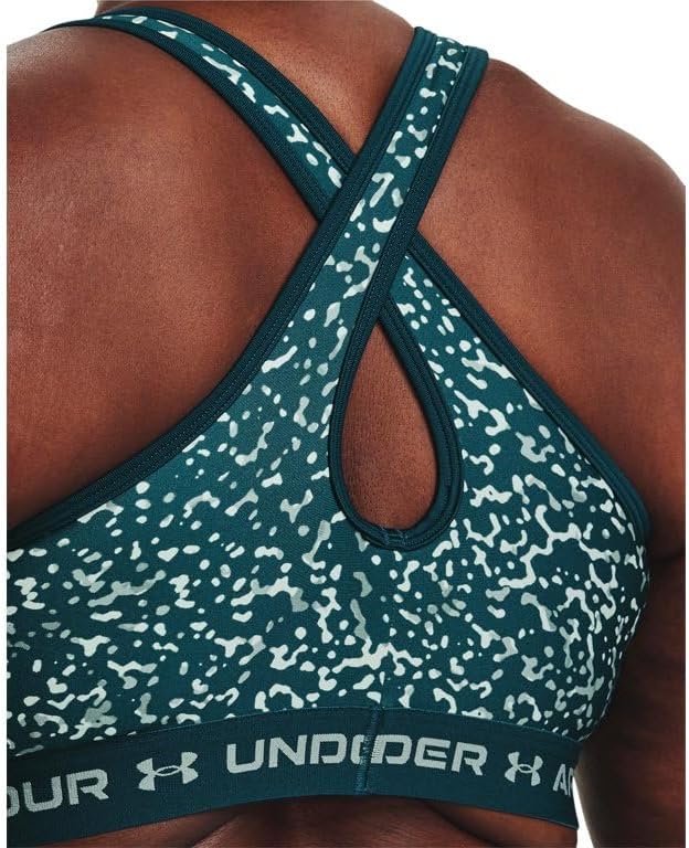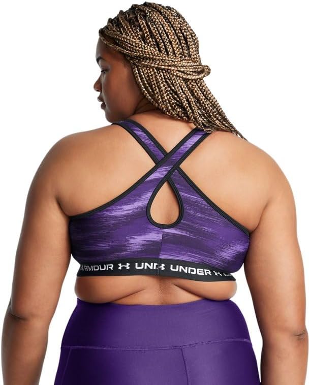 Introducing the Under Armour Women's Mid Crossback Print Sports Bra, an essential piece of apparel meticulously designed to provide strategic support tailored for medium-support activities such as cycling, weight training and boxing. This sports bra is crafted with a unique blend of comfort, style, and performance to meet the dynamic needs of real women. At the heart of this sports bra is the soft, quick-drying cups that not only provide extra structure and coverage but also feature perforations for added breathability. These cups are removable and come with right and left labels for your convenience. The crossover straps are designed with an updated keyhole detail that allows for easier on and off – a significant upgrade that embodies simplicity and functionality. The updated interior construction helps keep the pads in place during wear and wash, ensuring durability and longevity of the product. The elastic band feels super smooth and soft against the skin, adding to the overall comfort and wearability of the bra. Constructed with a double-layer of HeatGear fabric, this sports bra delivers a superior next-to-skin feel. This super-smooth material also wicks sweat and dries really fast and light, allowing you to push through your workouts with minimal discomfort. The compression feature offers an ultra-tight, second-skin fit that supports your movements without restricting them. Made from 87% Polyester and 13% Elastane, this sports bra provides the perfect balance of stretch and durability. It is imported and designed to be machine washed cold with like colors. It is recommended to remove the pads before washing and to avoid bleaching, ironing, using softeners, or dry cleaning. Available in an array of colors, the Under Armour Women's Mid Crossback Print Sports Bra lets you choose the hue that best matches your style. Whether you're hitting the gym, cycling around town, or training for a marathon, this sports bra has got you covered