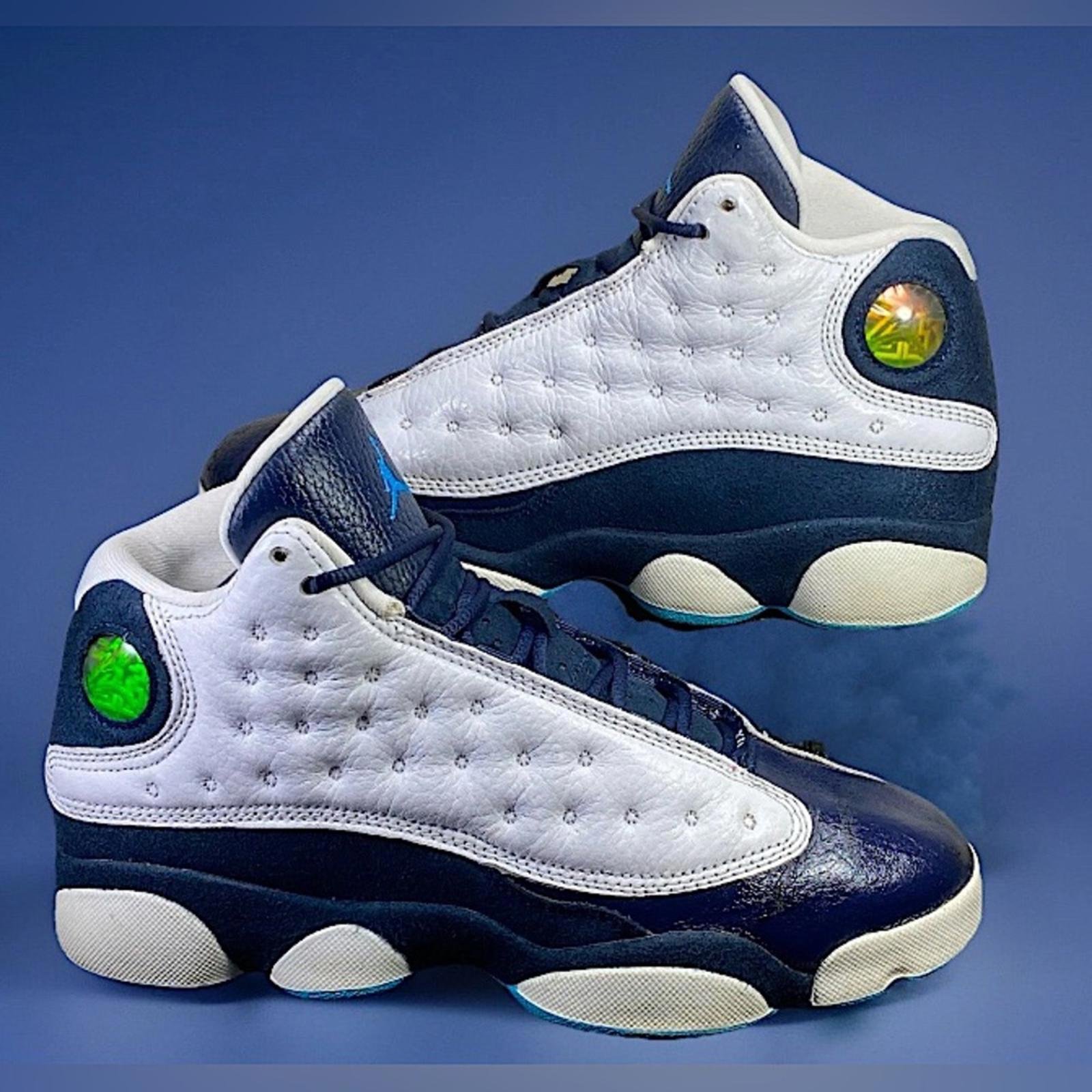 The Air Jordan 13 Retro 'Obsidian' updates the vintage mid-top with a familiar color scheme, one that combines stitched tumbled white leather with contrasting navy blue paneling. A Jumpman icon in Dark Powder Blue is embroidered atop the tongue, while the 13's holographic cat eye decorates the lateral ankle. Underfoot, the distinctive panther paw outsole features herringbone rubber traction pods and a carbon fiber shank plate for improved stability