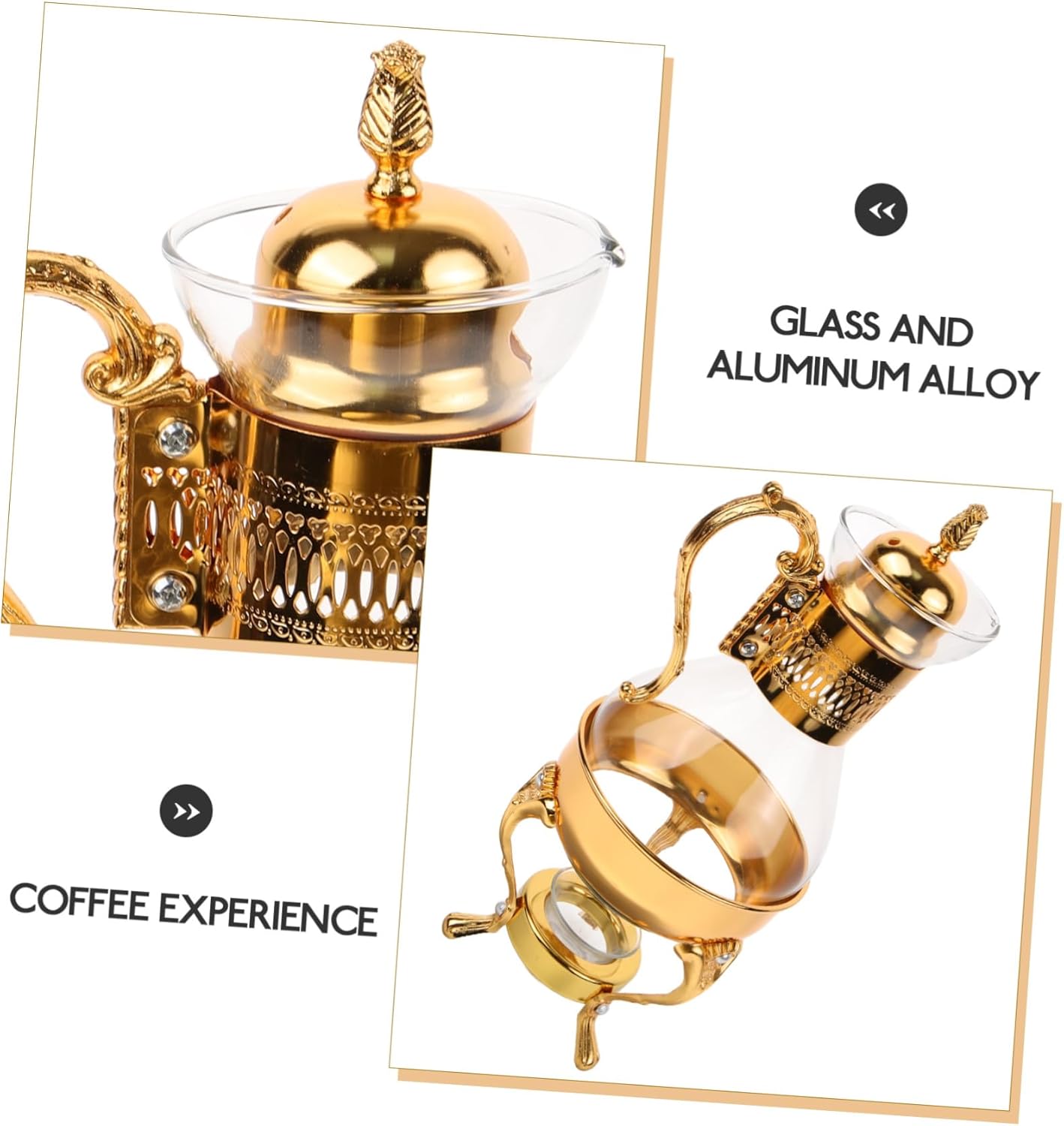 Package Include 1 x set of Arab coffee pot Features -Size:36.00X19.00X15.00cm/14.15X7.47X5.89in afternoon coffee pot -Color:Golden Coffee Kettle -Material:Glass and aluminum alloy reusable coffee kettle -Made of glass and aluminum alloy materials to durability Hotel Coffee Pot. -Indulge in an authentic Middle Eastern coffee experience with this set Vintage Coffee Kettle. -The unique and sophisticated look of this set adds a touch of luxury to any setting Restaurant Coffee Pot. -This coffee set features a versatile design suitable for both use Glass Coffee Kettle. -This complete coffee set includes a coffee pot, cups and tray for all your coffee serving needs glass coffee carafe.Goods DescriptionEuropean Style Coffee Pot The Middle Eastern-style coffee pot is the addition to your home or hotel.Hotel Coffee Pot Its unique design and appearance add a touch of luxury to your coffee time.glass coffee carafe Made of glass and aluminum alloy, this coffee pot is not only but also easy to clean.Glass Coffee Kettle The set includes a coffee pot, cups and tray, providing a complete