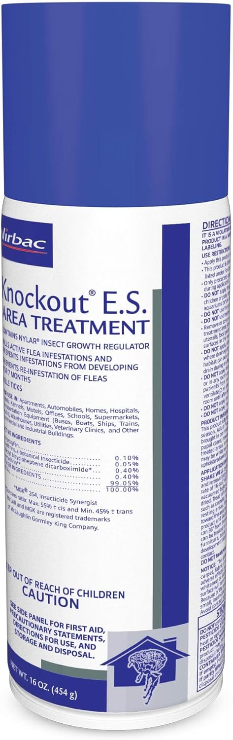 Virbac Knockout E.S. Spray aerosol spray that kills adult fleas and ticks and prevents flea infestation for up to 7 months.