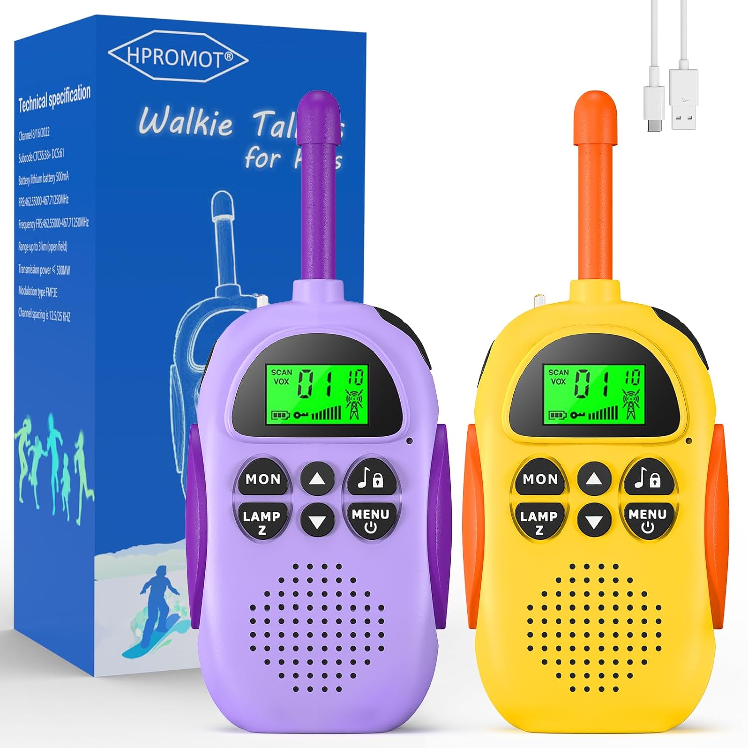 | BuiltIn Media | 2 Pack Rechargeable Kids Walkie Talkies, 2 x USB charging cable |