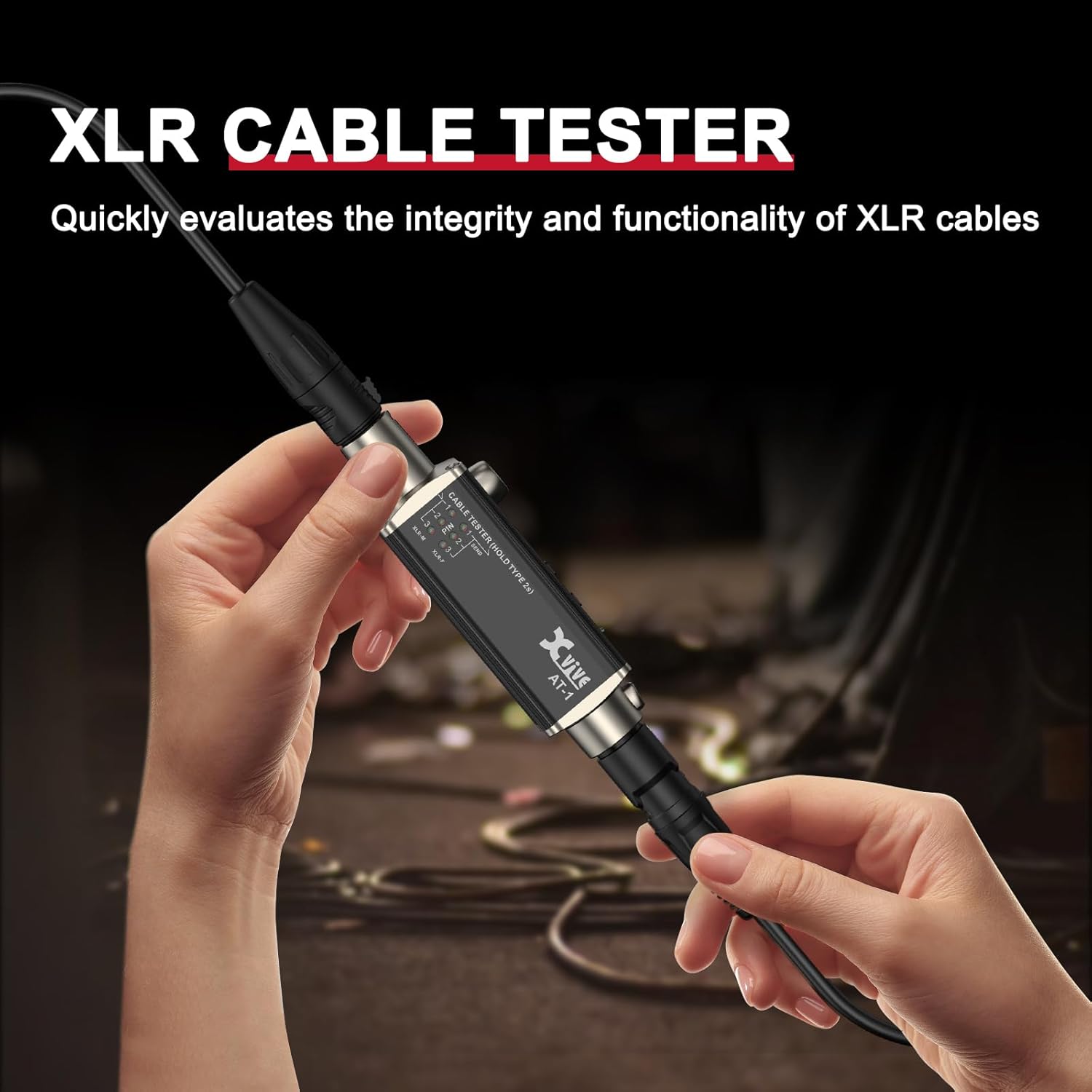The Xvive AT-1 Portable Audio Tester is a compact, feature-packed utility tool designed to keep your audio equipment and cables performing flawlessly. Ideal for audio professionals, this versatile device ensures your gear is always up to the task, offering five essential functions to streamline testing and troubleshooting. It includes a signal generator that can emit 1 kHz tones or pink noise audio signals, an XLR cable tester for detecting whether XLR cables are damaged, XLR input metering to measure the strength of XLR input signals, a phantom power check to test voltage and ensure normal operation, and headphone and speaker monitoring to listen to input signals. The AT-1 is powered by a built-in rechargeable battery, which is recharged via a USB-C port.