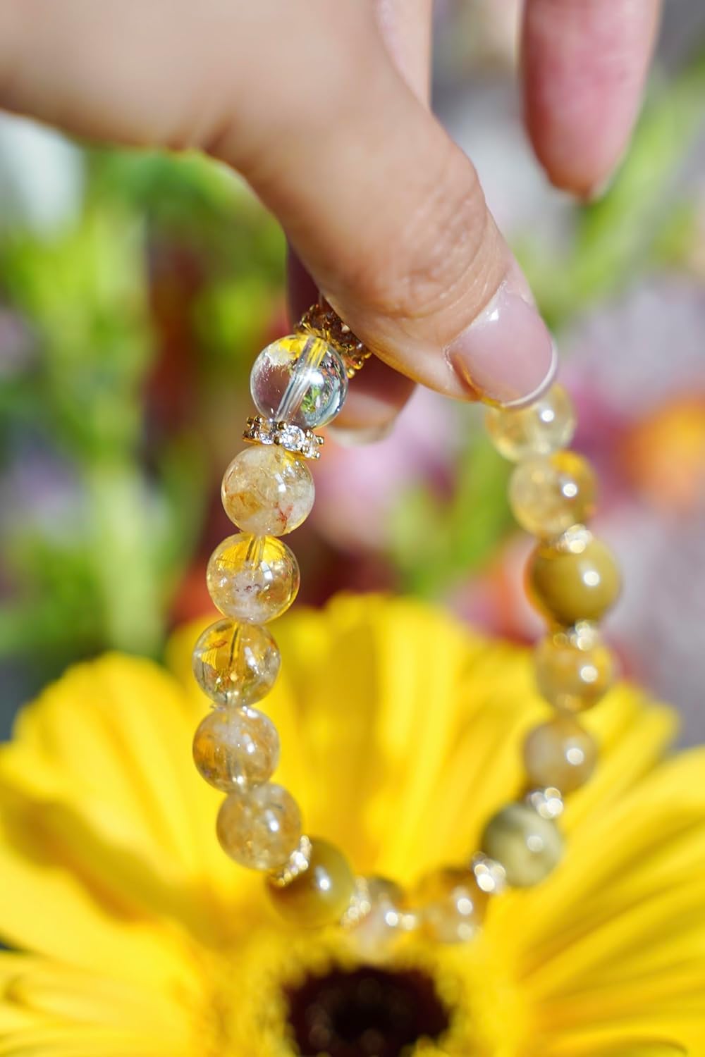 The Yellow Rutilated Quartz Wealth Attraction Bracelet is crafted from natural yellow rutilated quartz beads, admired for their radiant needle-like inclusions and warm, uplifting tones. Often associated with prosperity, confidence, and forward momentum, yellow rutilated quartz symbolizes opportunity and abundance. Paired with clear quartz accent beads, this bracelet balances grounding energy with clarity and focus, creating a harmonious and versatile design. Its soft golden hues add a refined statement that complements both casual and polished styles. Handcrafted with care and strung on a comfortable elastic cord, this bracelet is suitable for daily wear, meditation, or as a meaningful gift for those seeking positivity, confidence, and prosperity. ⚠️ Safety & Care Information Avoid contact with water, chemicals, or perfumes. Store in a dry place when not in use. Natural crystals may vary slightly in color and texture. Not intended for medical or therapeutic use. For adult use only. Not a toy. Keep away from children and pets.